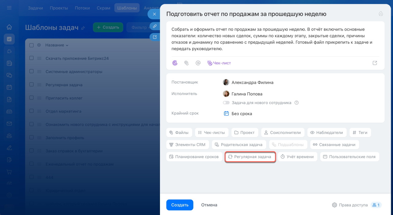 Создайте шаблон задачи, по которому будут работать сотрудники. Укажите участников, прикрепите нужные файлы и добавьте дополнительные инструменты. Нажмите Регулярные задачи и настройте график повторения. Это поможет выполнять повторяющиеся процессы по одному алгоритму и не тратить время на лишние уточнения.