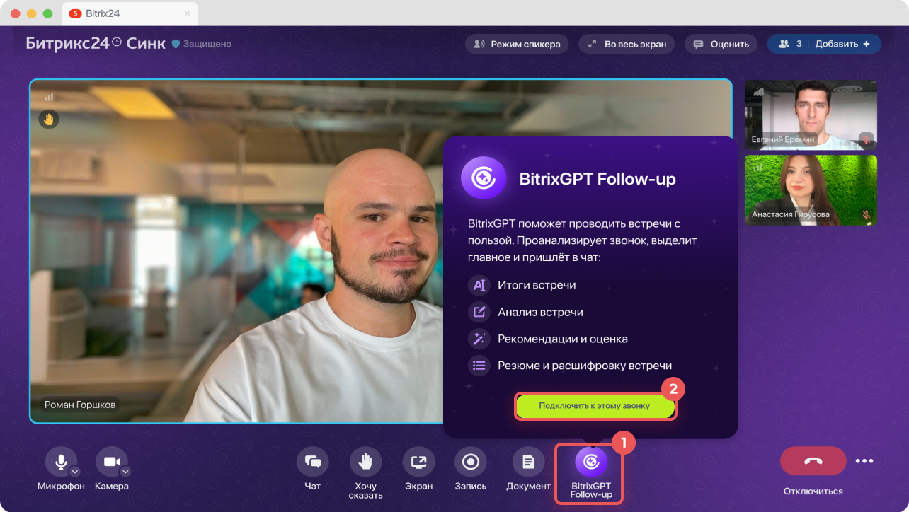 BitrixGPT Follow-up для видеозвонков. Искусственный интеллект анализирует видеозвонки: делает расшифровку, фиксирует договоренности и оценивает вовлеченность участников. Это помогает не терять важные решения после встречи и повышать эффективность команды.