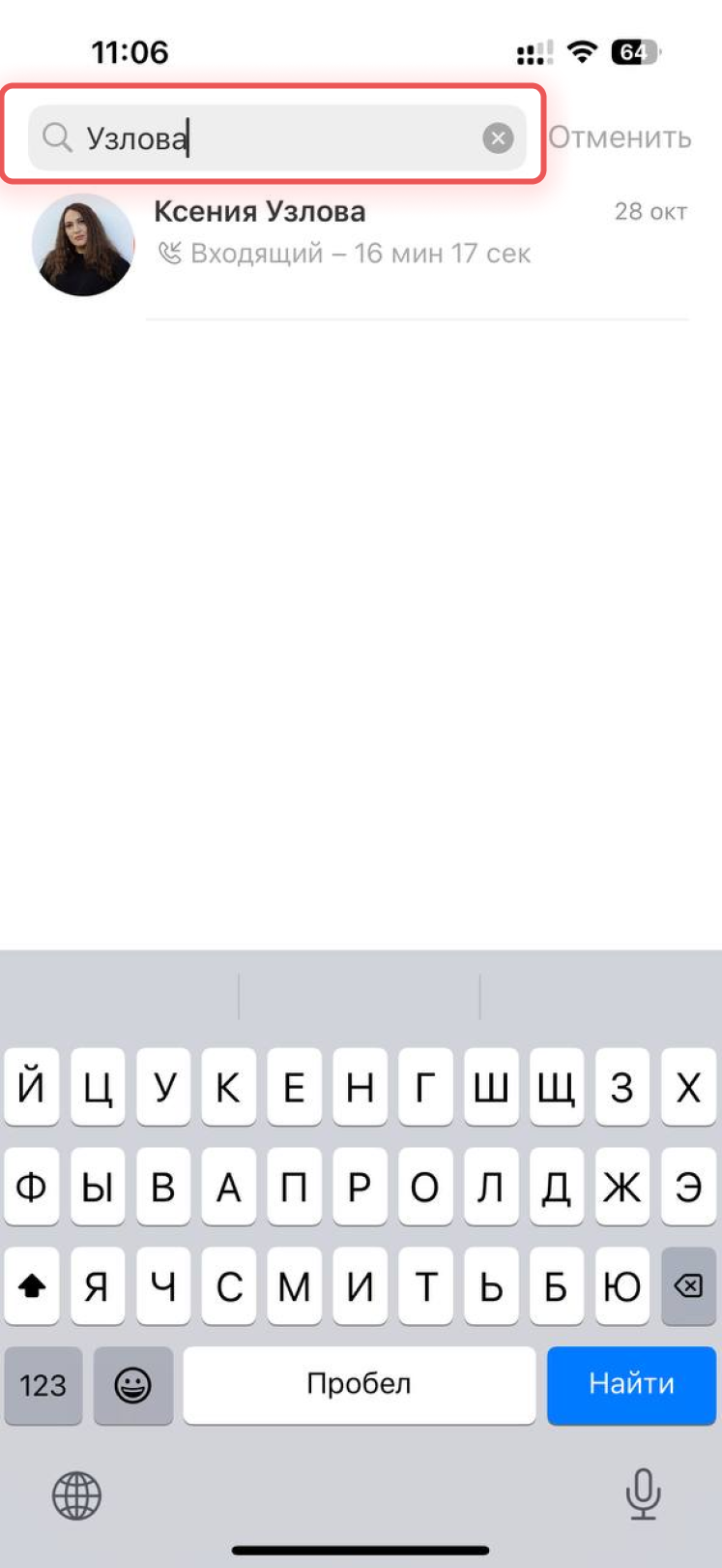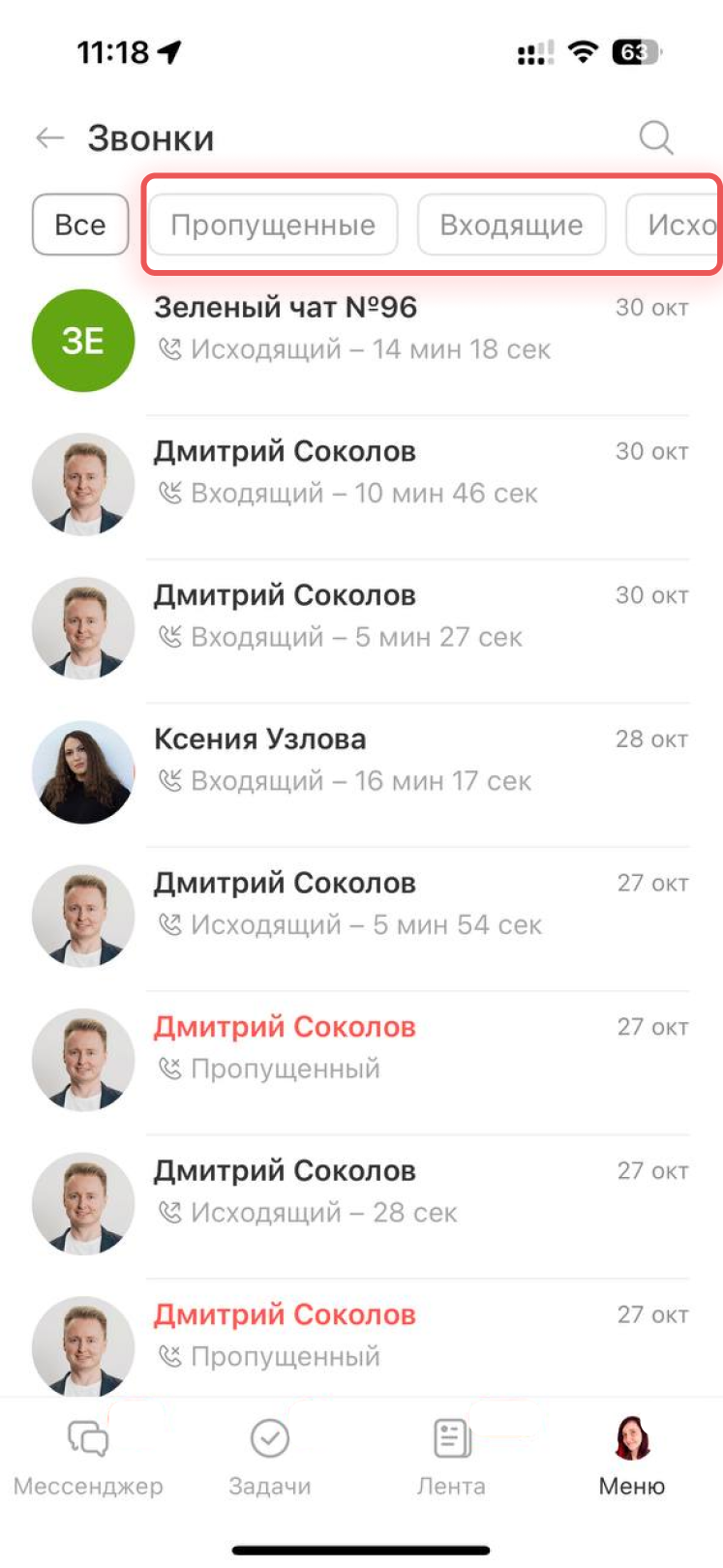 Список звонков в мобильном приложении. Теперь входящие, исходящие и пропущенные вызовы доступны в одном разделе. Можно быстро перезвонить коллеге прямо из приложения.