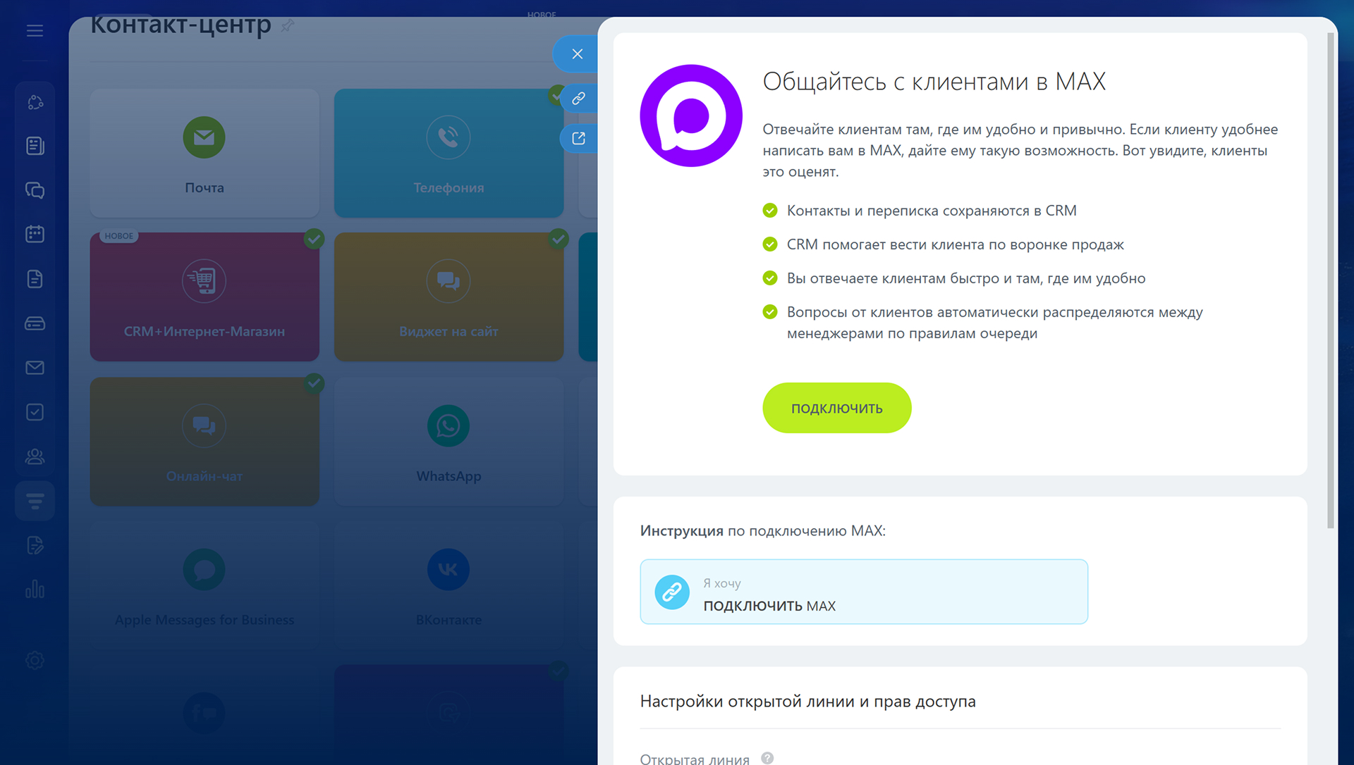 - Контакт-центр и мессенджер MAX — обращения из мессенджера MAX попадают в открытые линии Битрикс24. Менеджеры отвечают из одного окна, а история общения сохраняется в CRM.