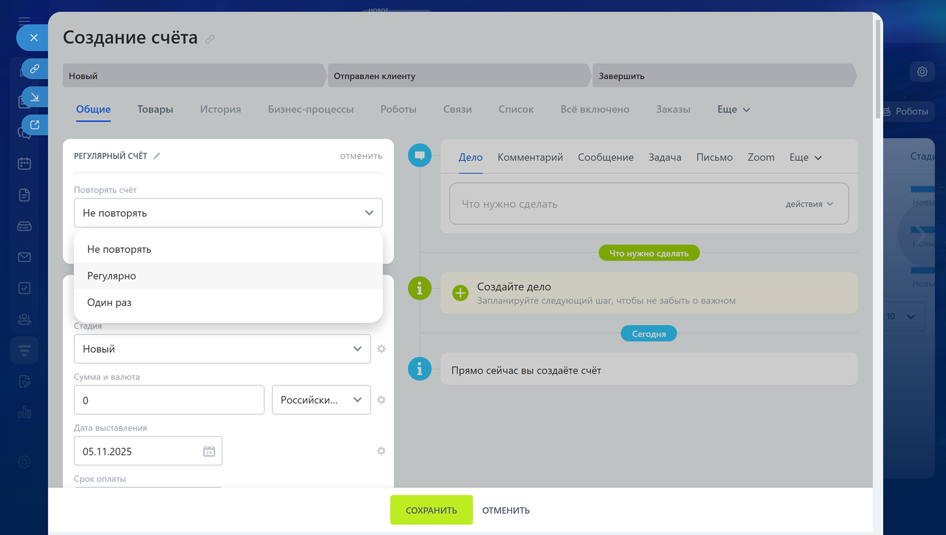 Регулярные счета. Если клиент оплачивает услугу по подписке, аренду или обслуживание, можно один раз настроить расписание — CRM создает и отправляет счет в нужный день. Клиент получает напоминание вовремя, а менеджеру не нужно каждый месяц формировать счета вручную.