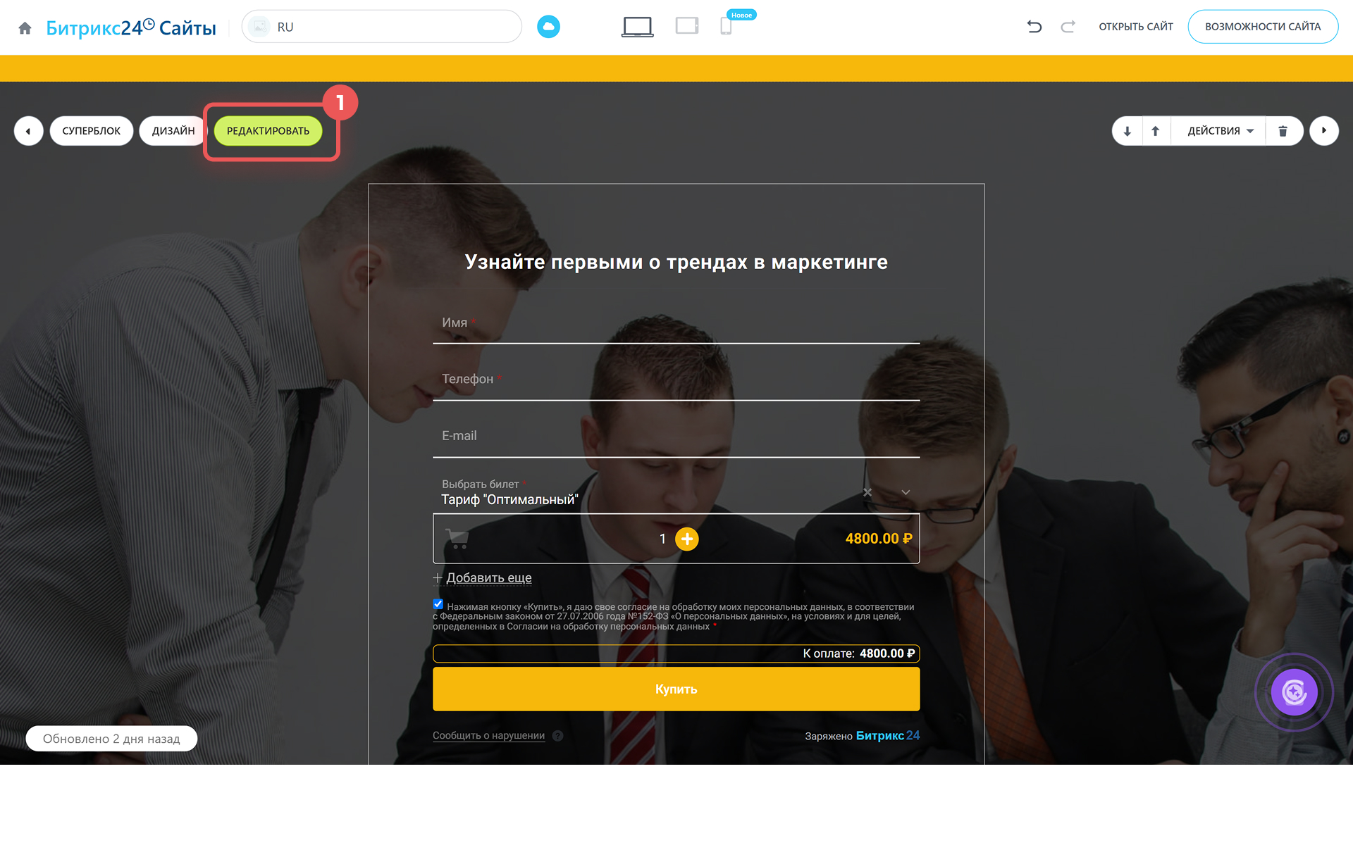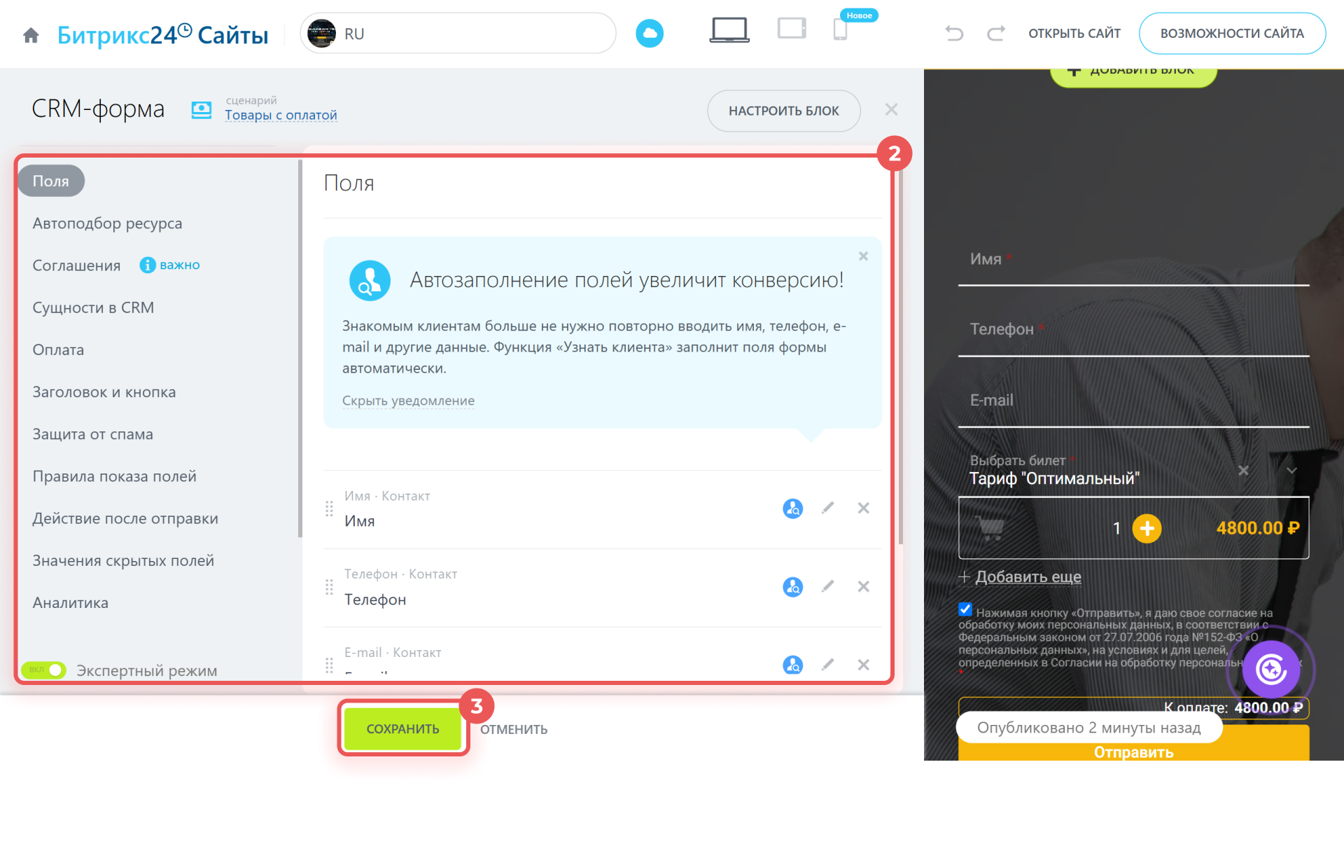 Размещать можно только активные CRM-формы. Редактировать сайт могут сотрудники, у которых есть право на изменение контента.