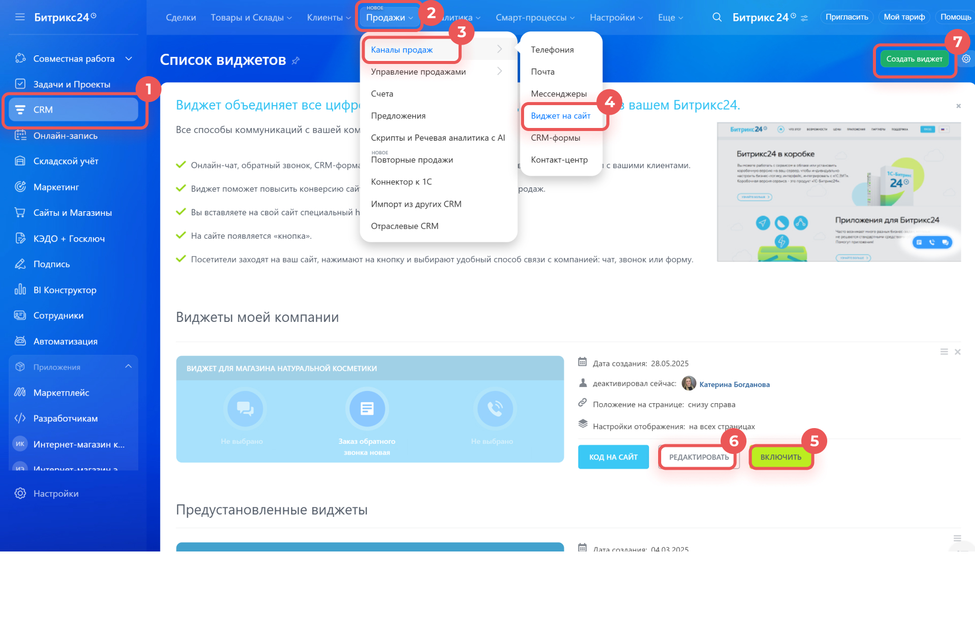 1–4. Перейдите в раздел CRM > Продажи > Каналы продаж > Виджет на сайт.