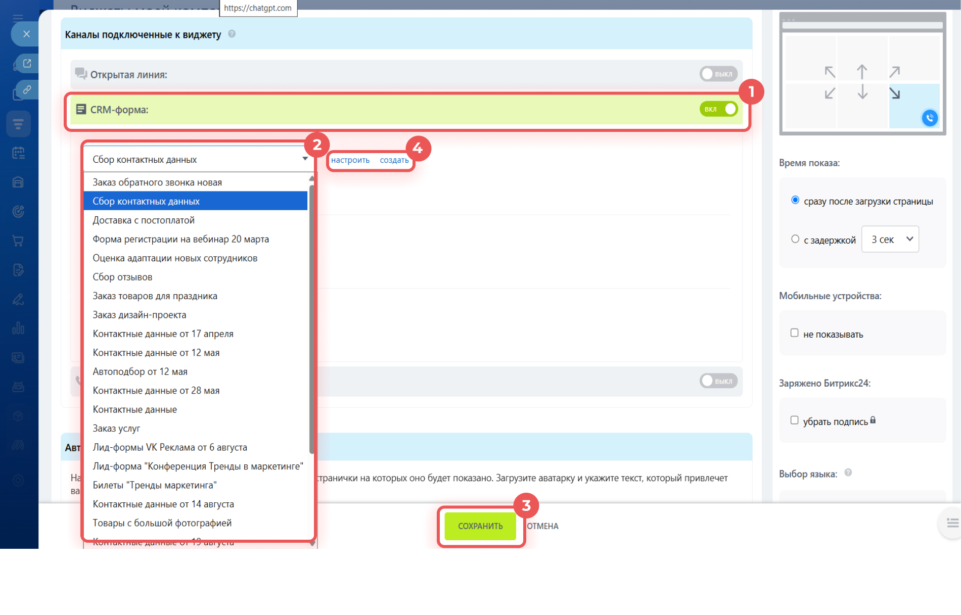 1–2. Включите канал CRM-форма и выберите нужную форму из списка.