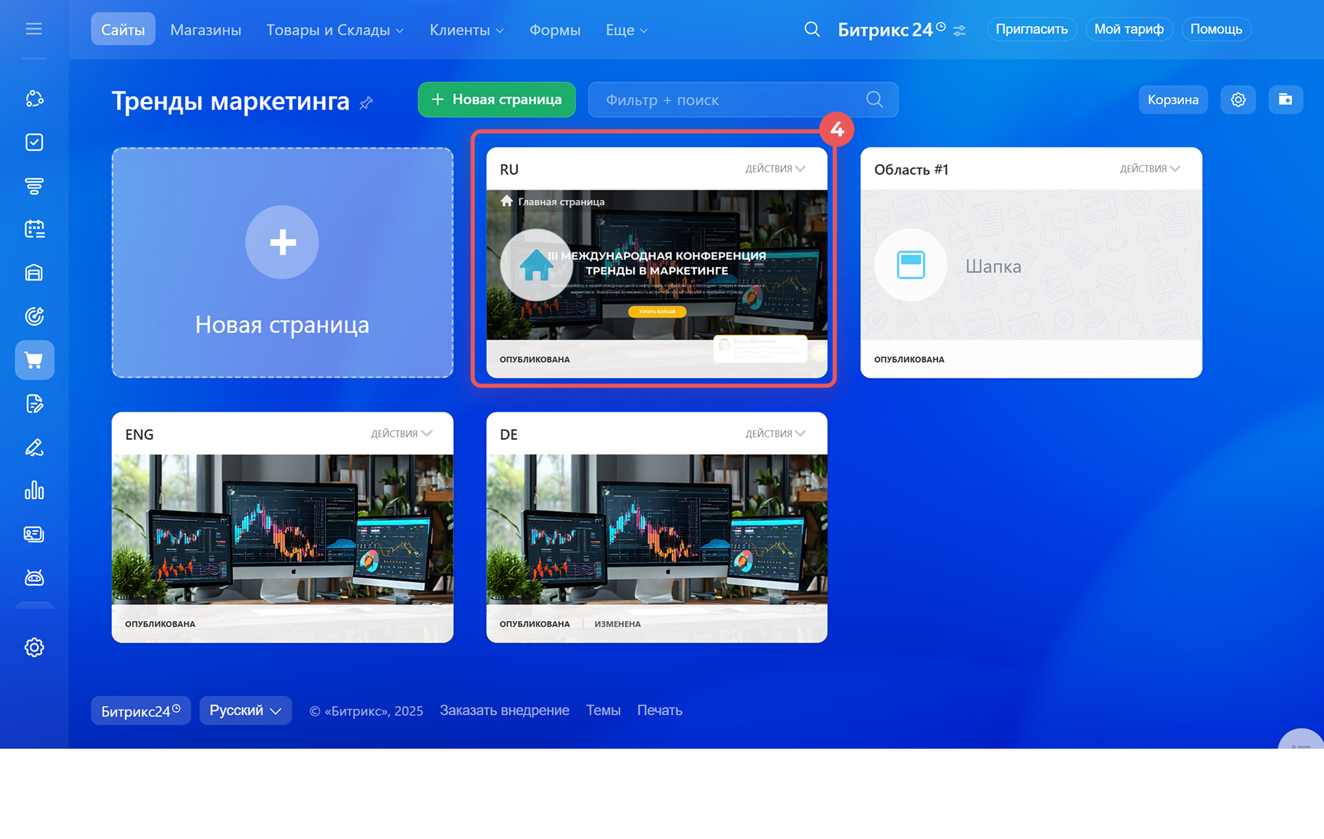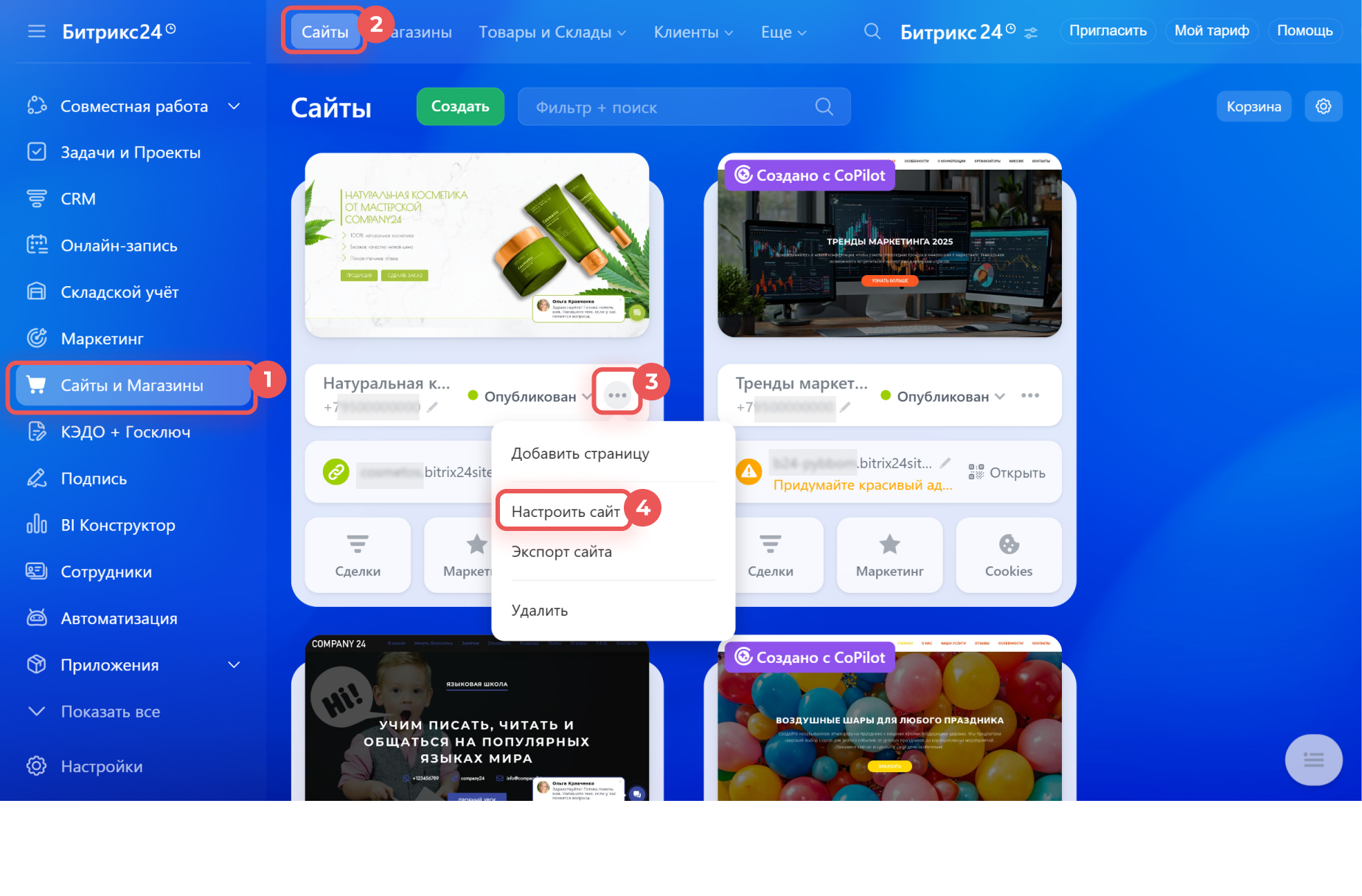 1–2. Перейдите в раздел Сайты и Магазины > Сайты и выберите нужный сайт.