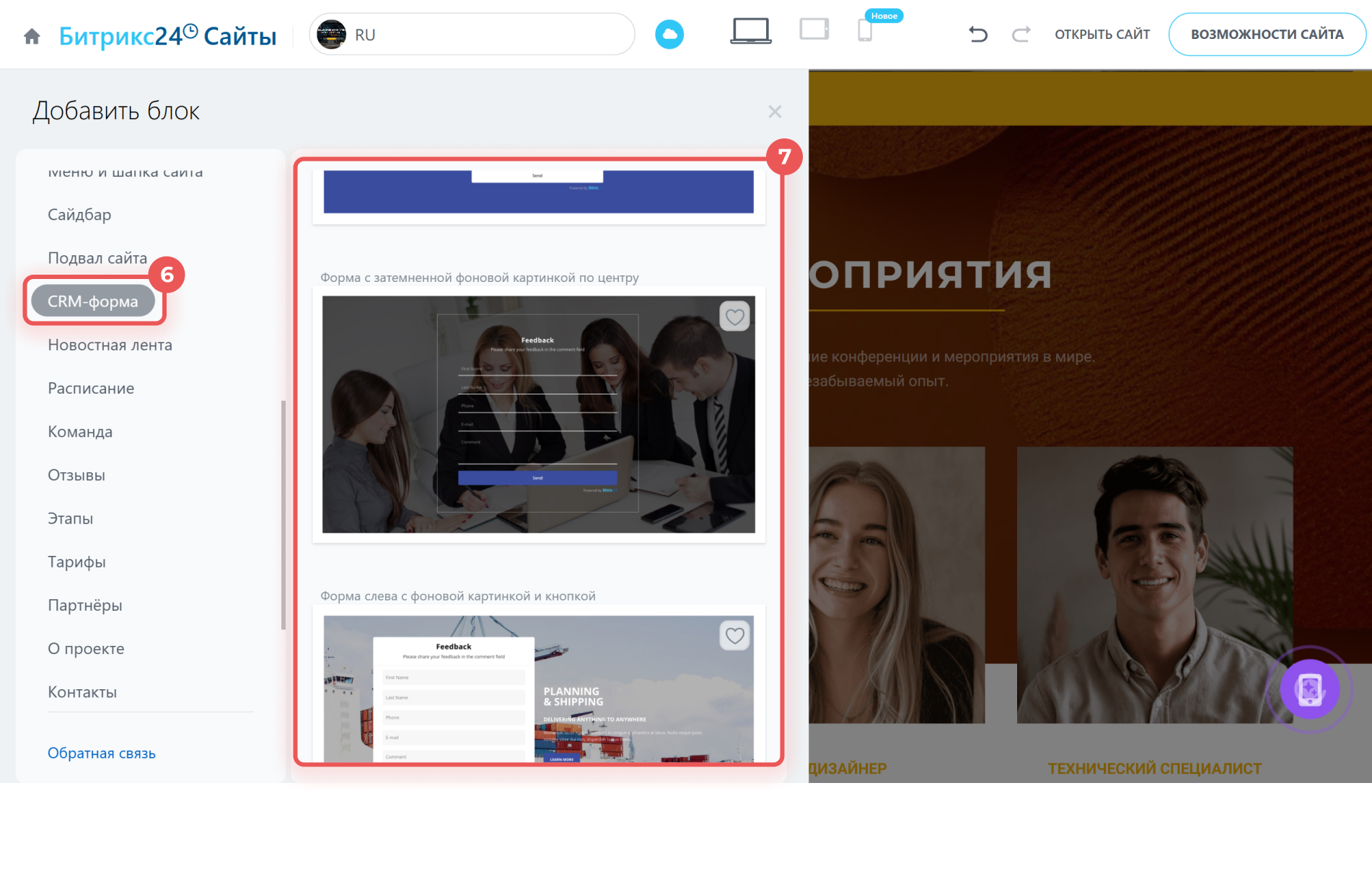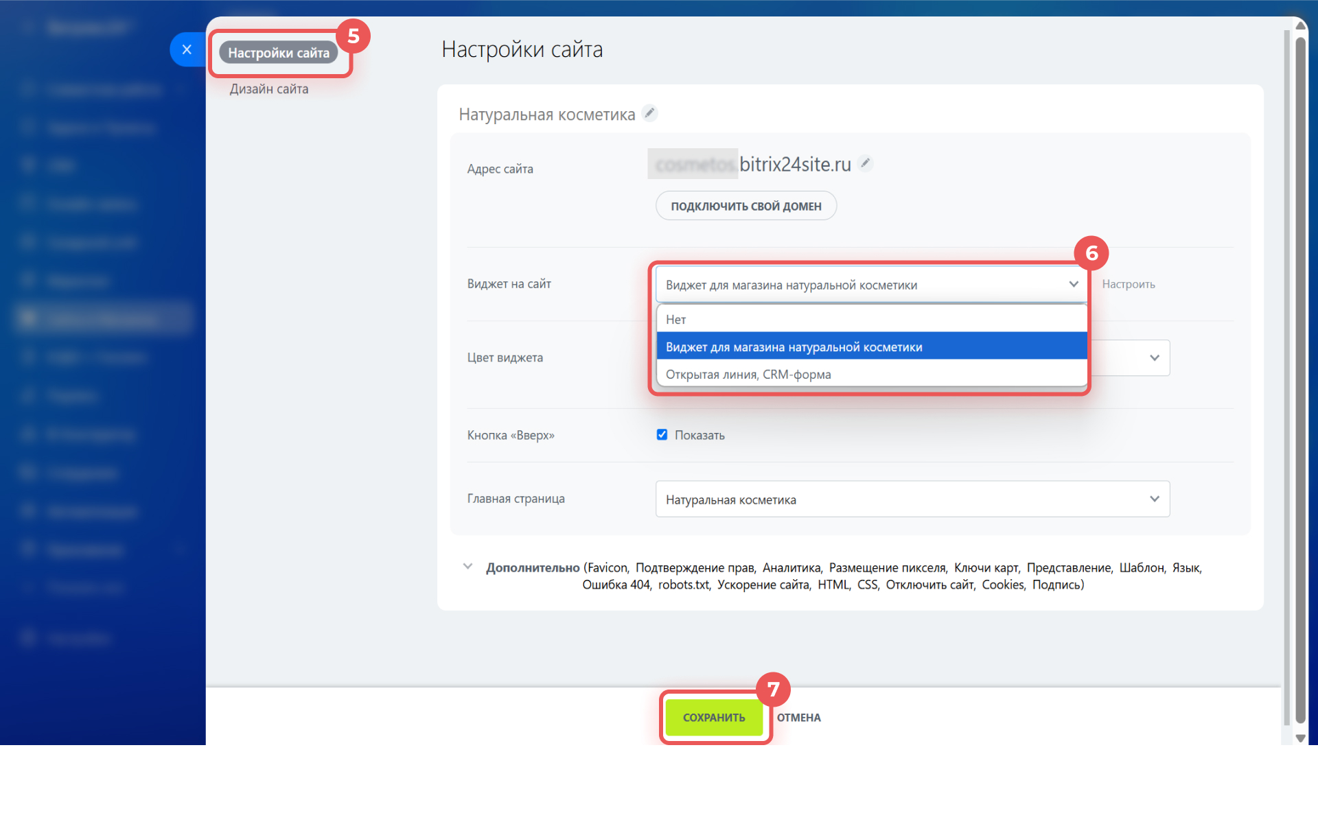 5–6. В разделе Настройки сайта выберите из списка виджет с CRM‑формой.
