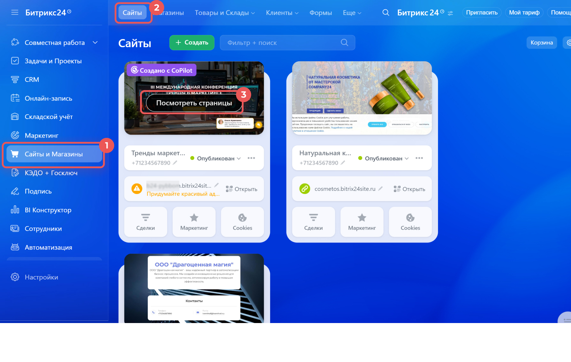 1–2. Перейдите в раздел Сайты и Магазины > Сайты.
