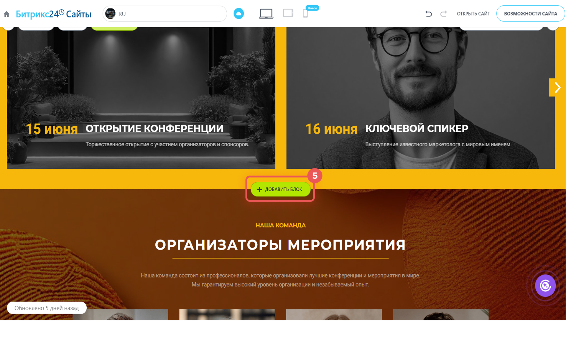 - Чтобы добавить блок с формой, откройте нужную страницу сайта и нажмите Добавить блок > CRM-форма, выберите нужный шаблон. Нажмите Редактировать, чтобы настроить блок и форму.