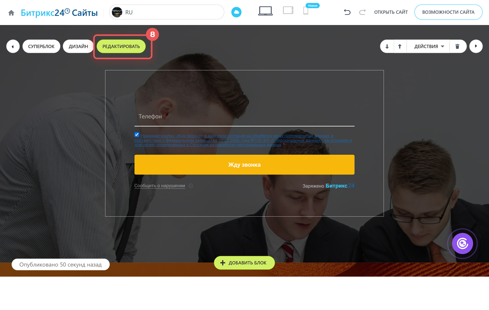 8. Чтобы изменить форму и настроить блок, нажмите Редактировать.