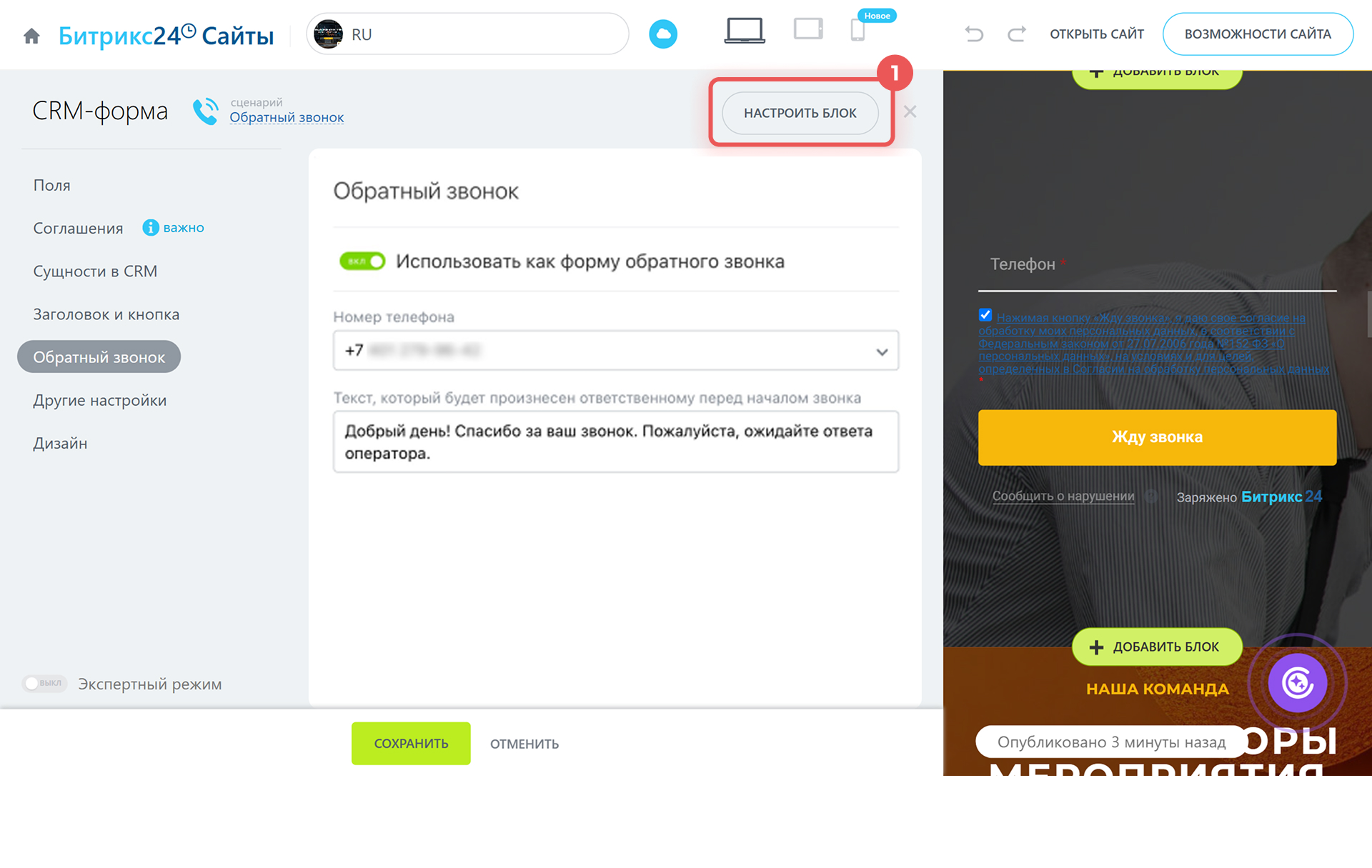 Настроить блок. На сайт добавляется блок с одной из созданных в вашем Битрикс24 CRM‑форм, но вы можете выбрать другую: