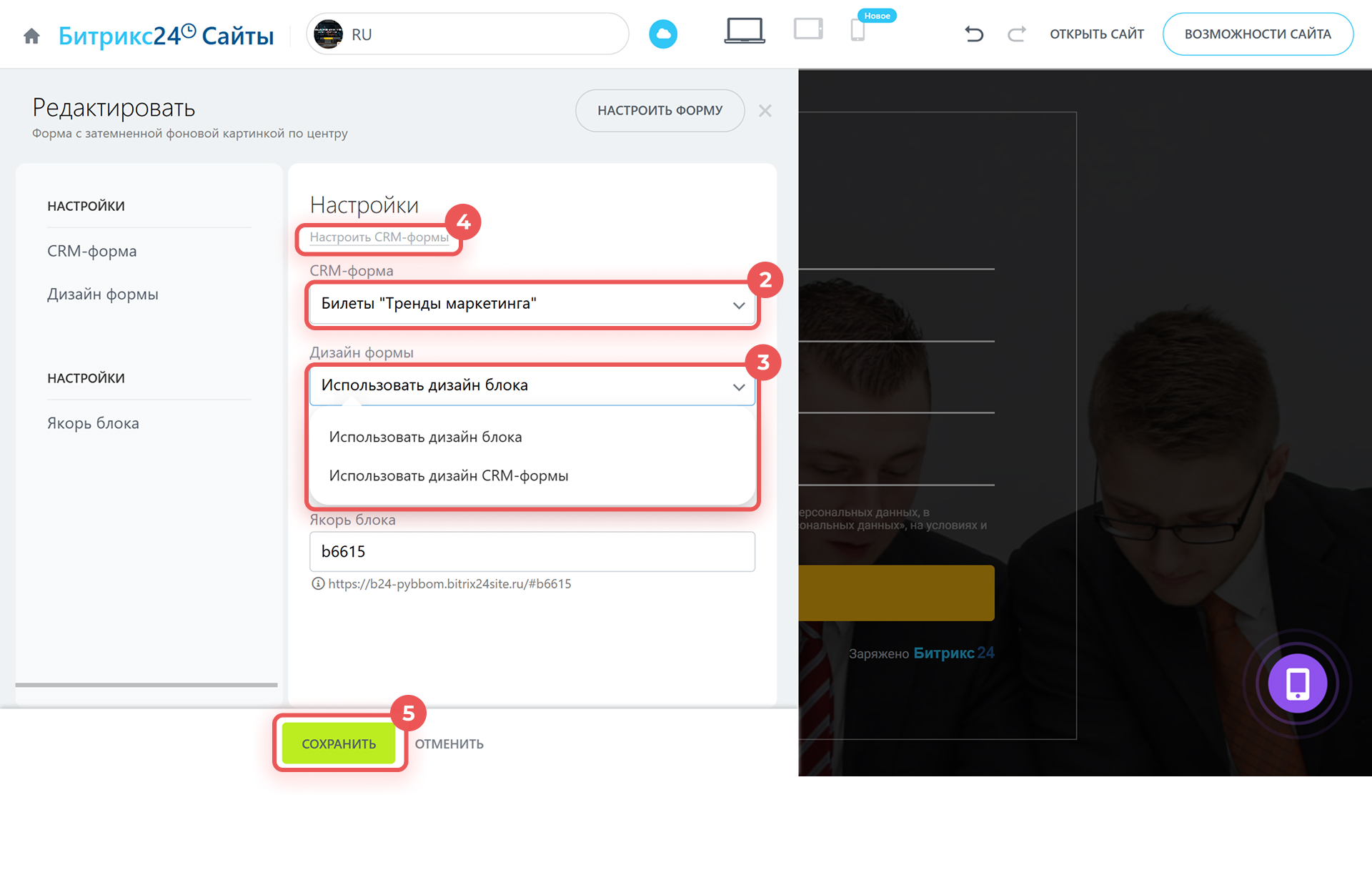 6–7. Перейдите на вкладку CRM-форма и выберите шаблон.