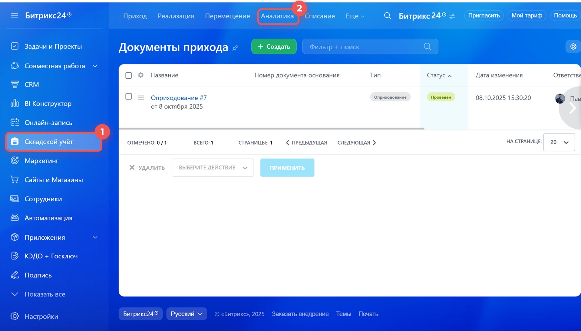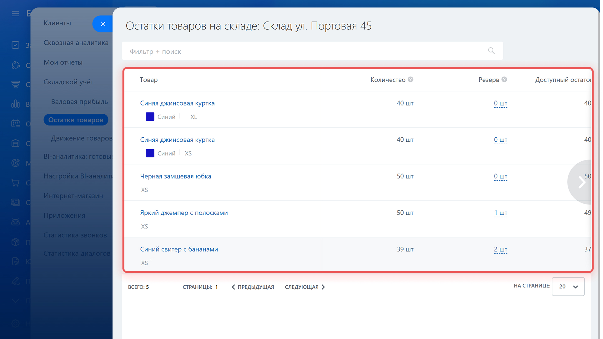 - Резерв — сколько товаров забронировано менеджерами в сделках.