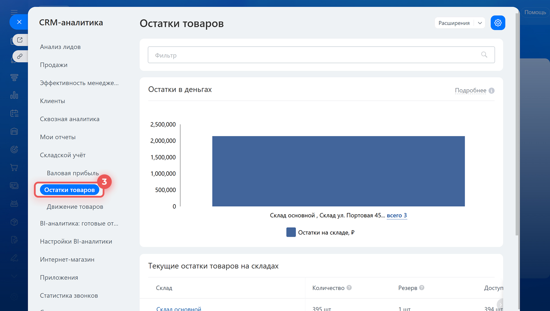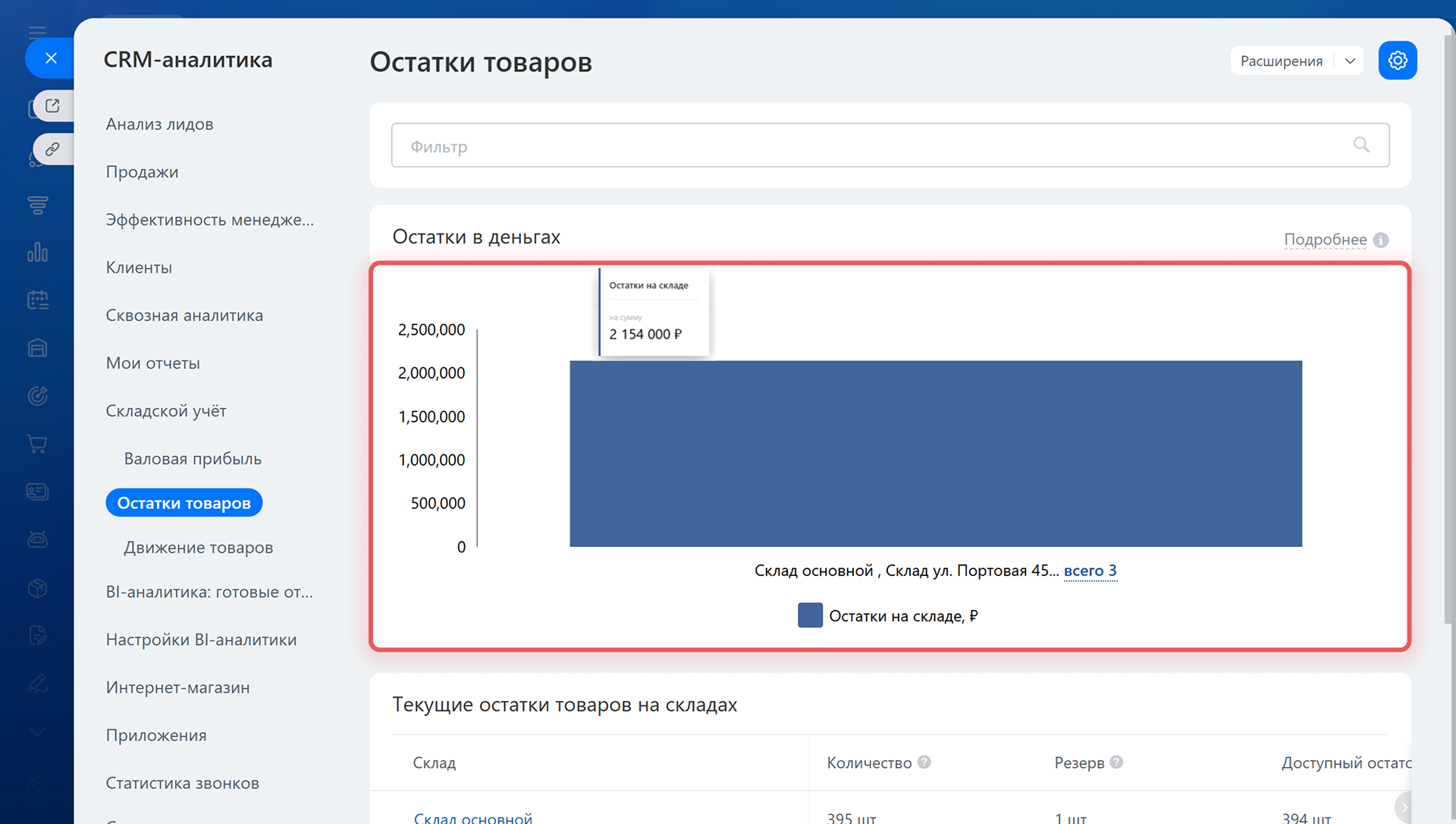 Отчет показывает, сколько товара на каждом складе, сколько уже зарезервировано в сделках и какой объем доступен для продажи. Данные из отчета помогут заметить дефицит, спланировать закупки и решить, когда перевезти товар между складами. Например, руководитель может заметить, что товара на складе не хватает, и заказать новую партию.