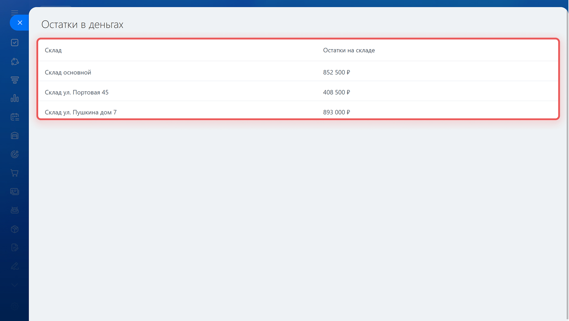 - В верхней части отчета показана общая стоимость запасов на всех складах. В нижней — таблица с текущими остатками. Для каждого склада можно открыть детальную информацию о товарах, которые на нем хранятся.