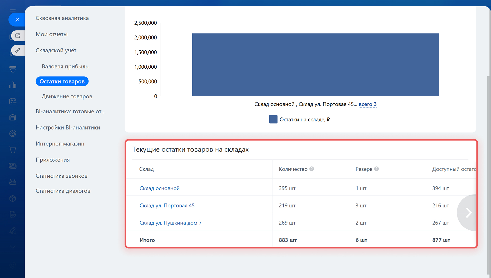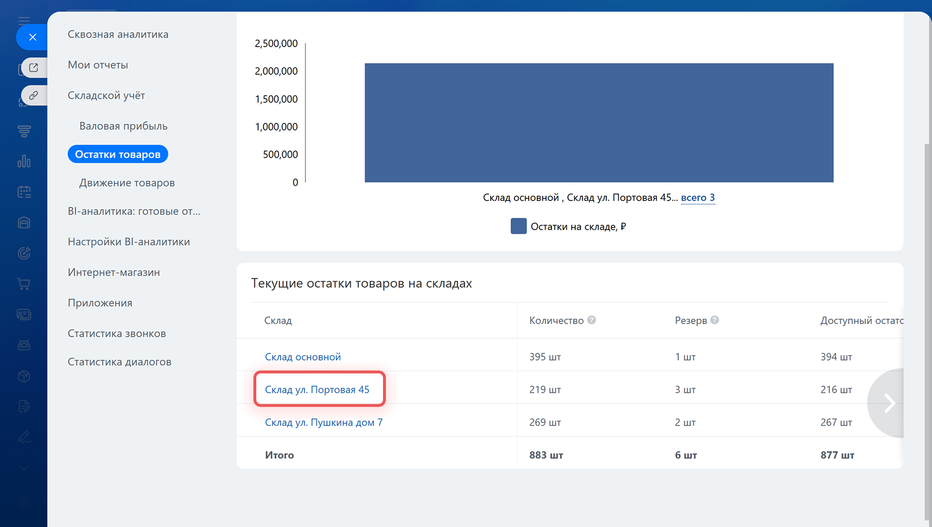 По каждому складу можно посмотреть детальную информацию о товарах, которые на нем хранятся. Нажмите название склада — откроется таблица с количеством, резервом и доступным остатком товаров. Информация поможет спланировать закупки или перераспределить запасы.