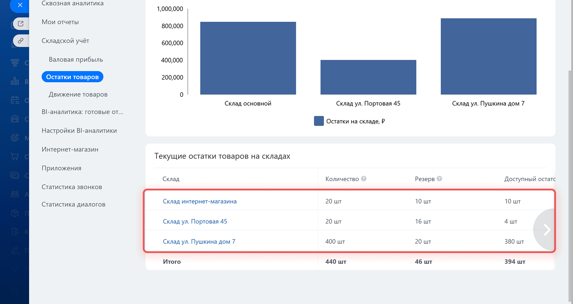 - Отчет об остатках показывает, сколько товара на каждом складе, сколько уже в резерве и сколько доступно для продажи.