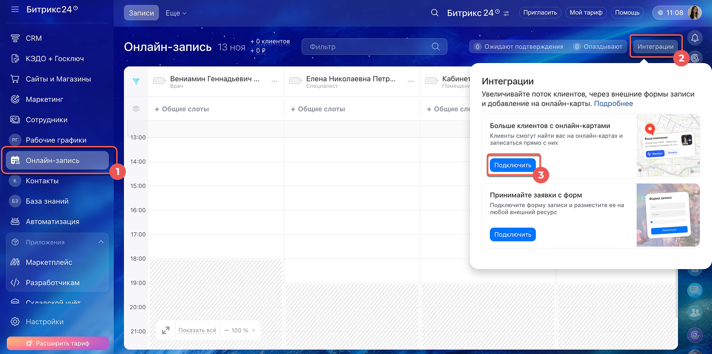 1–2. Перейдите в раздел Онлайн-запись > Интеграции.