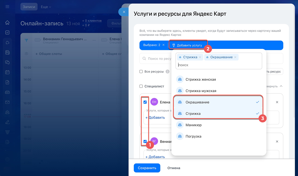 Чтобы ускорить настройку, можно выбрать сразу несколько специалистов и добавить к ним одну или несколько услуг. Например, выбрать несколько мастеров и добавить к ним услуги «Стрижка» и «Окрашивание».