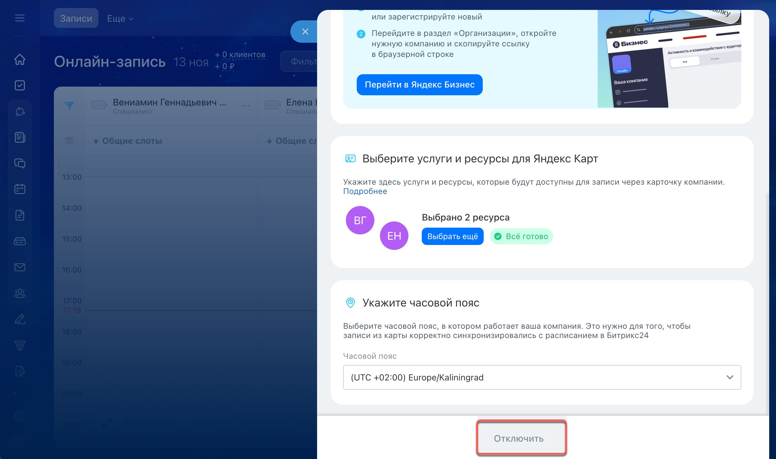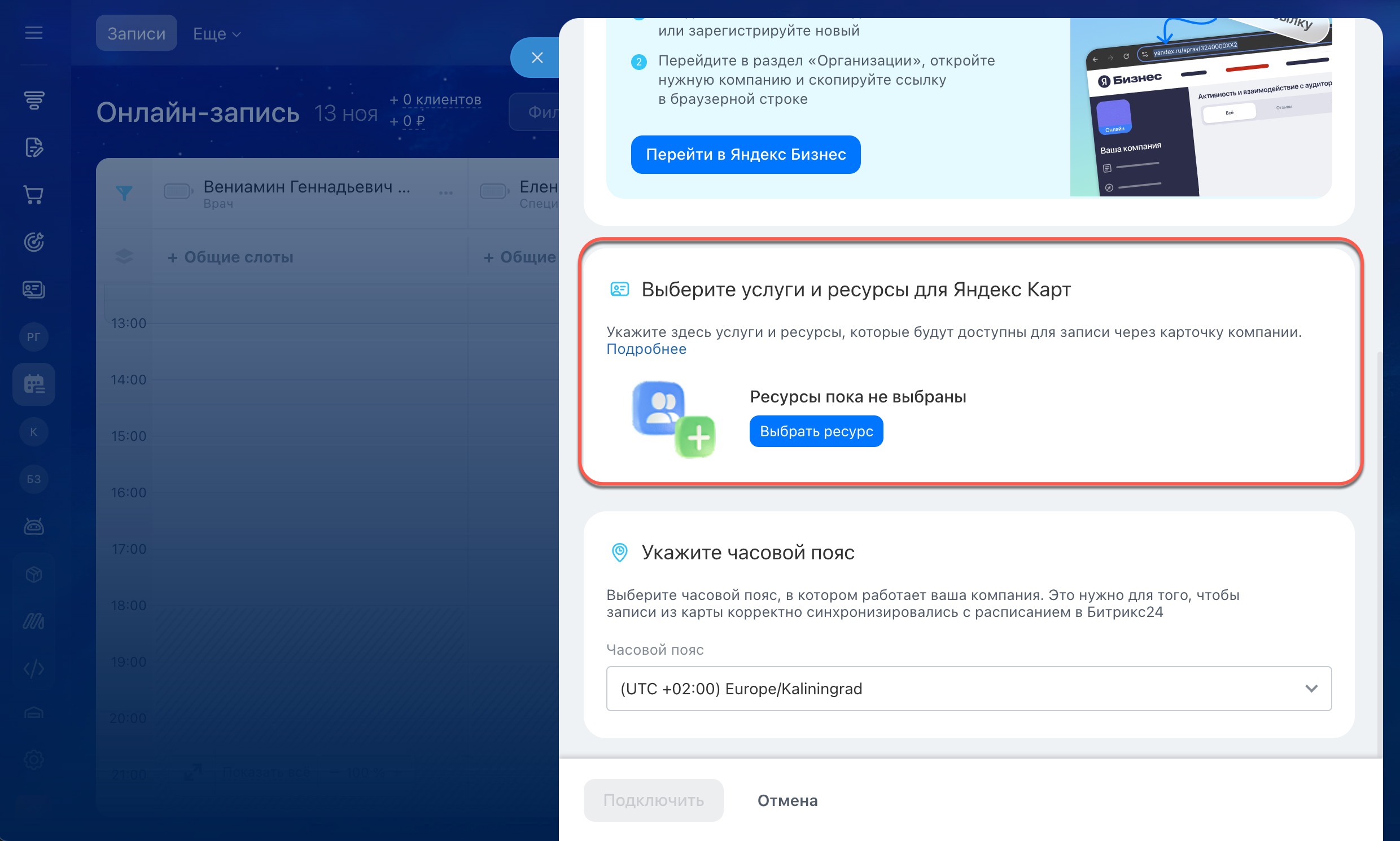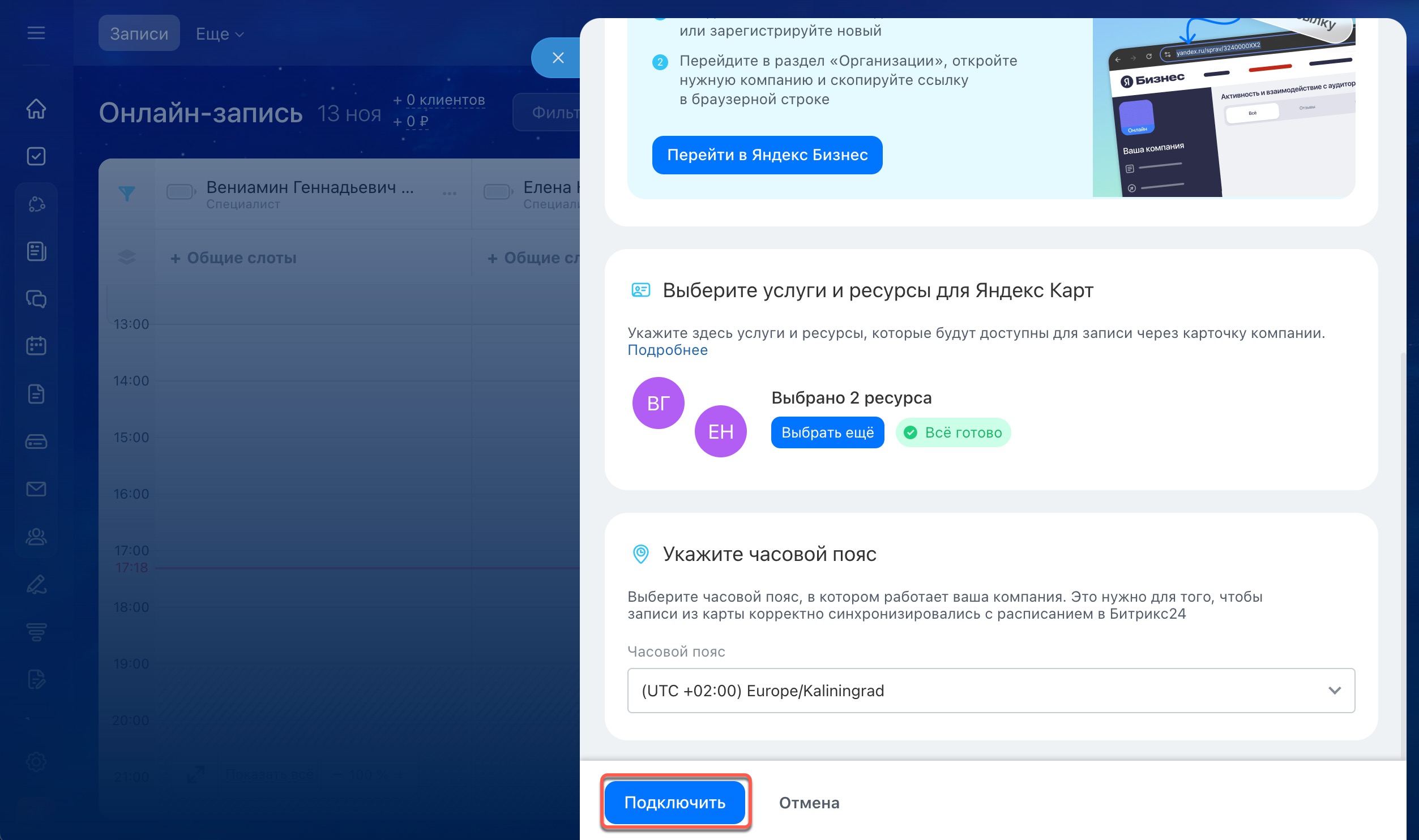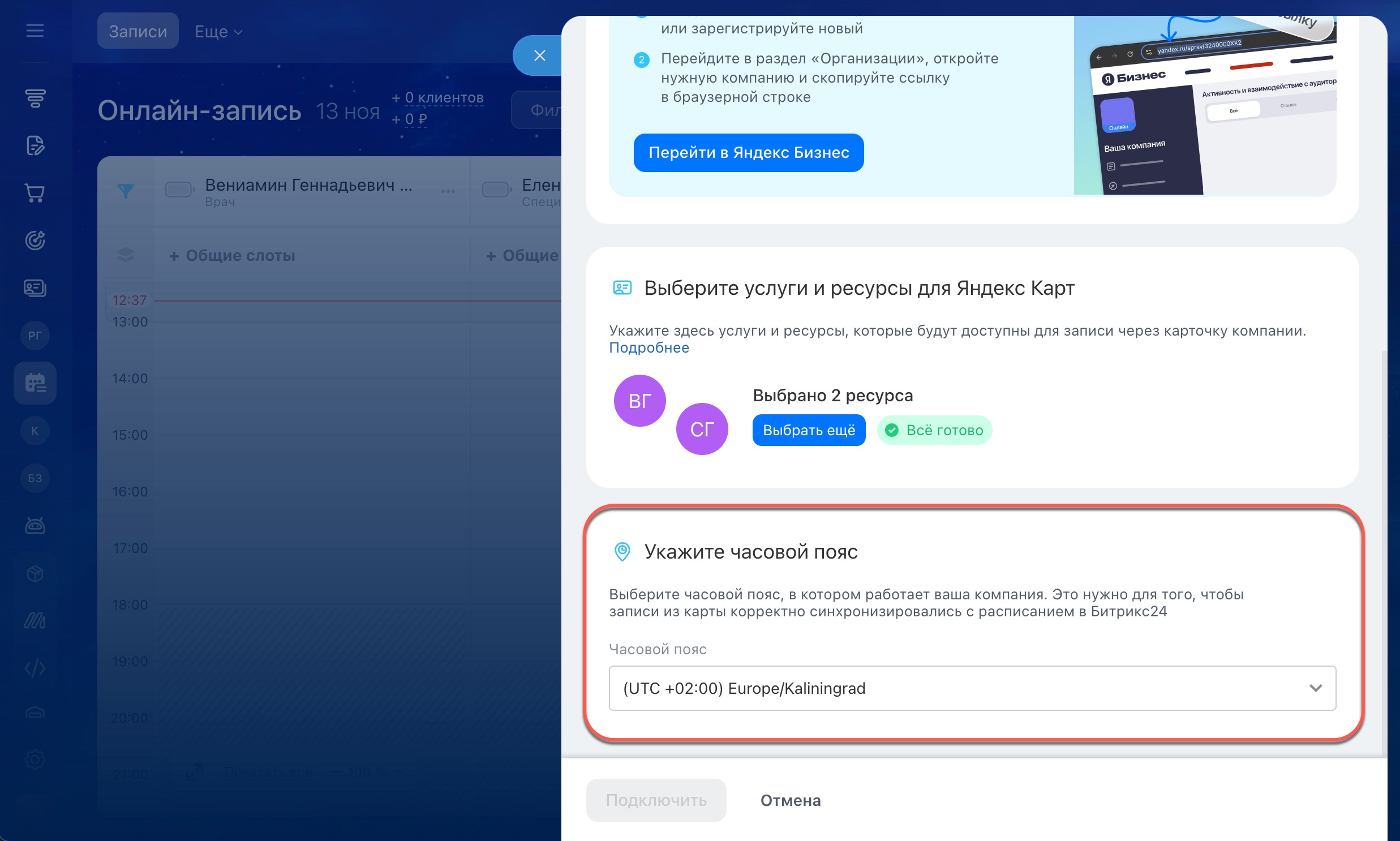 - Чтобы подключить интеграцию, свяжите Битрикс24 с кабинетом в Яндекс Бизнес, выберите услуги и ресурсы для записи и укажите часовой пояс, в котором работаем ваша компания.