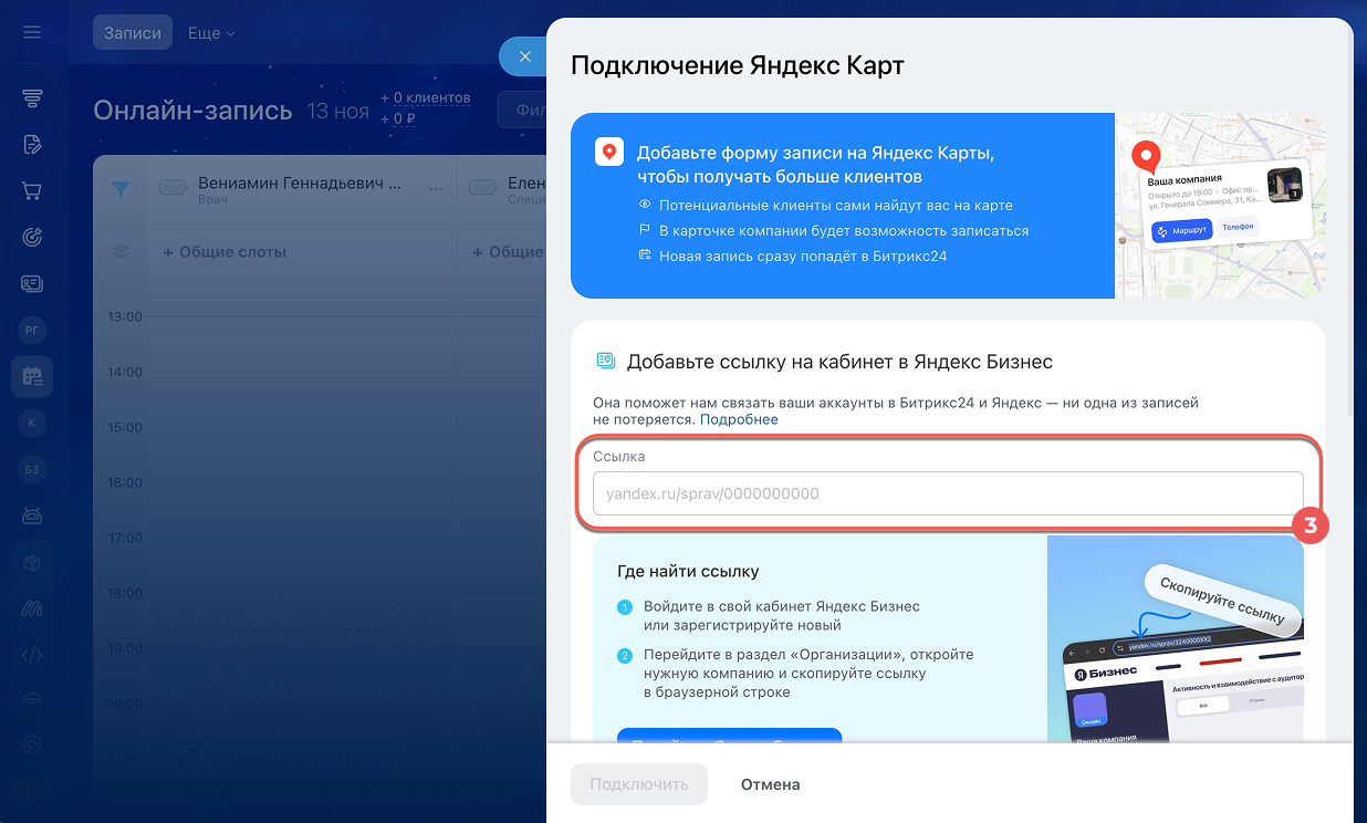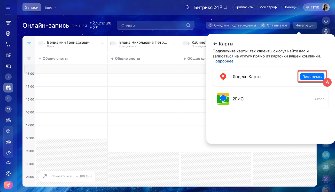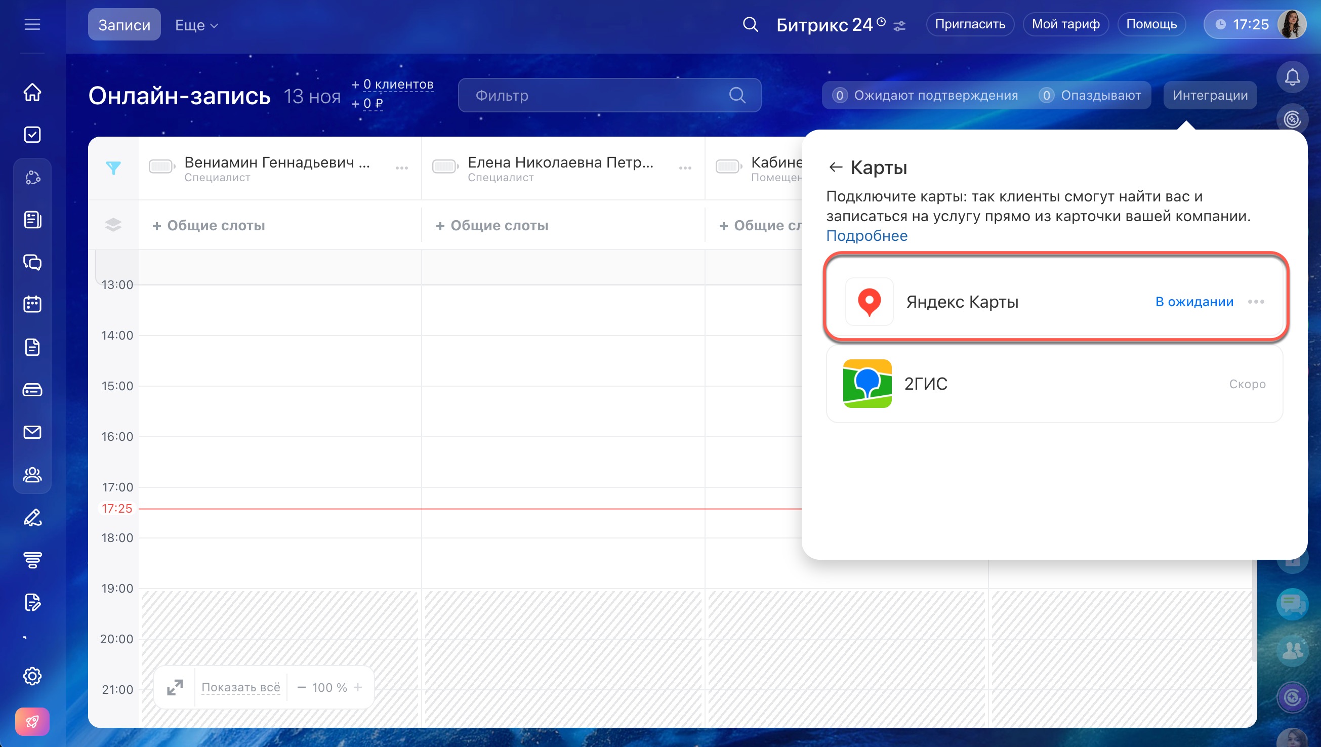 - Интеграция Онлайн-записи в Битрикс24 с Яндекс Картами помогает привлекать новых клиентов без дополнительных затрат. Они могут записываться на услуги прямо из карточки вашей компании в Яндексе — без звонков и переходов на сайт.