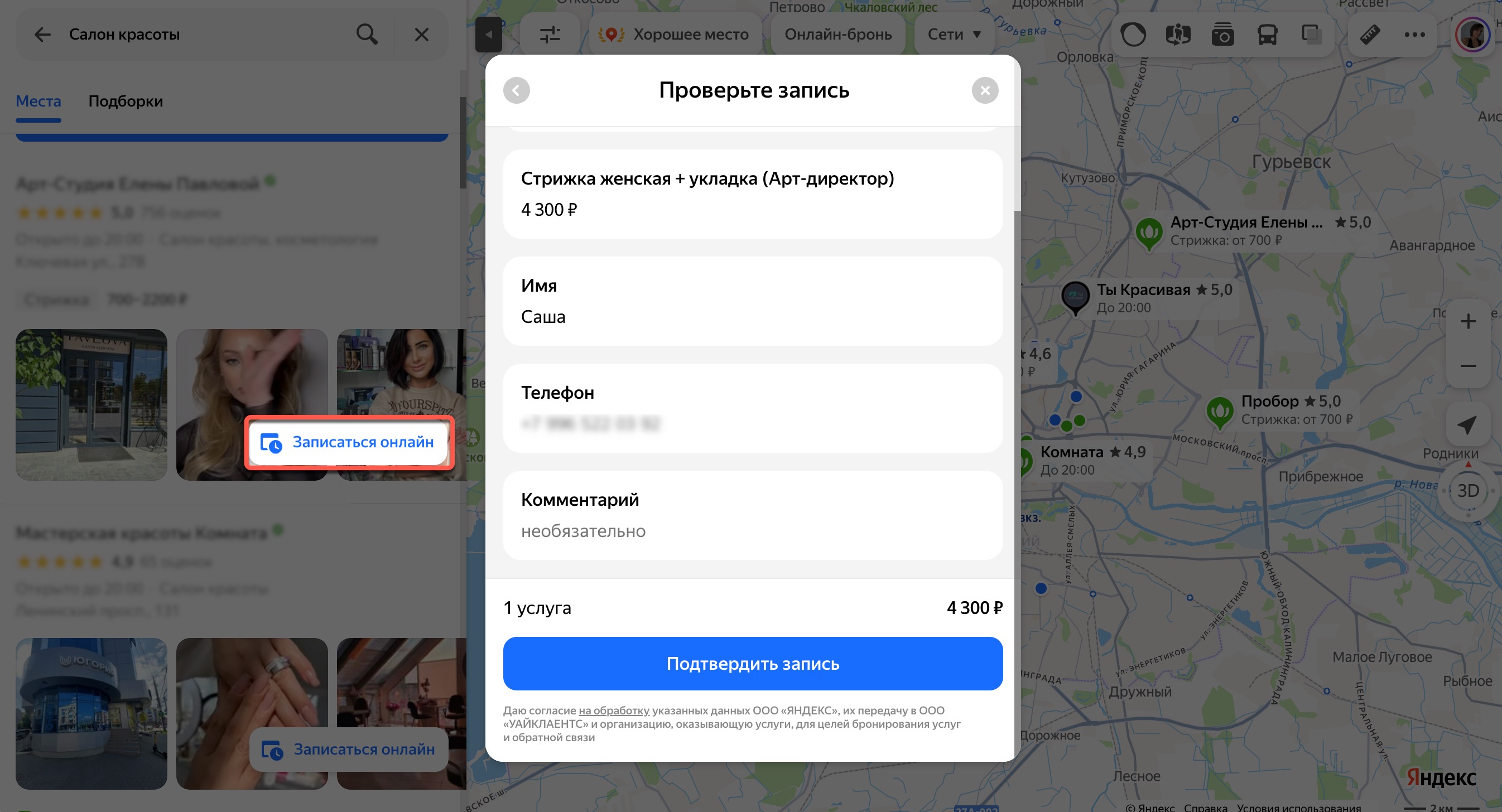 Интеграция Онлайн-записи с Яндекс Картами помогает привлекать новых клиентов без дополнительных затрат. Они могут записываться на услуги прямо из карточки вашей компании в Яндексе — без звонков и переходов на сайт.