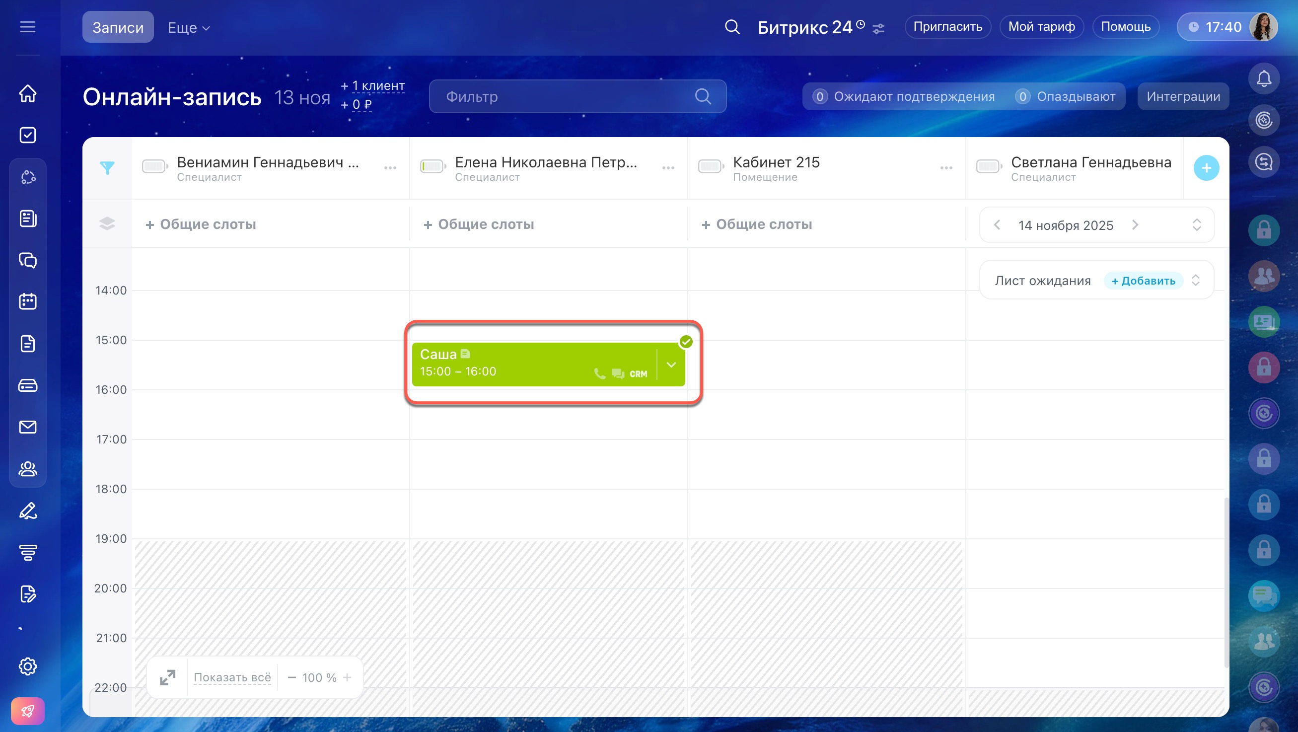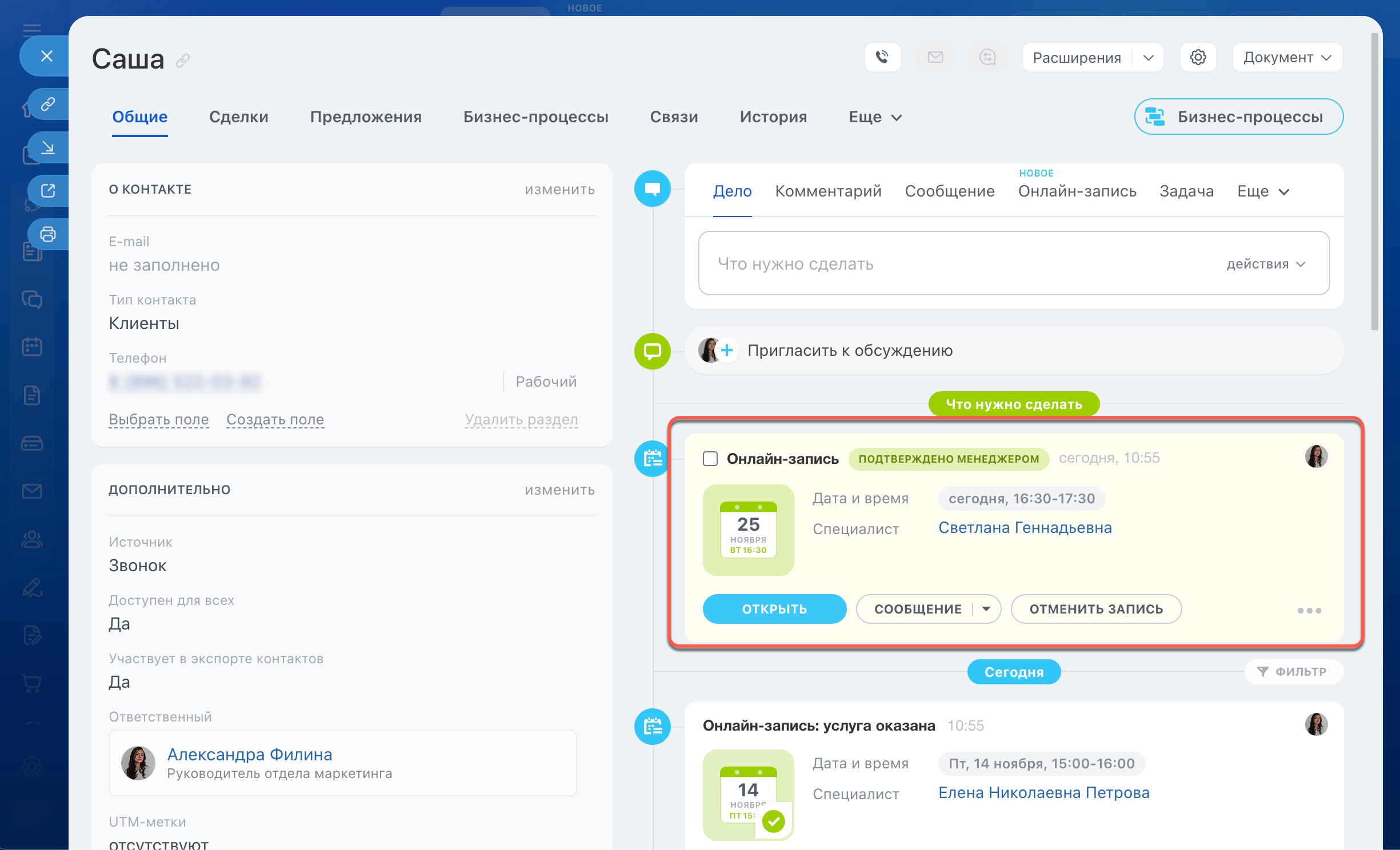 - Все записи автоматически появляются в разделе Онлайн-запись и карточке CRM, где их можно подтвердить, перенести или отменить.