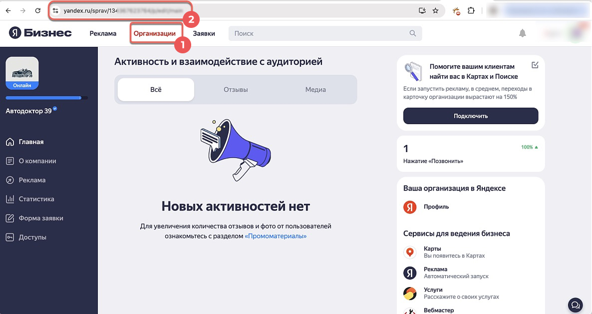 1. Войдите или создайте новый кабинет Яндекс Бизнес. Перейдите в раздел Организаци и откройте карточку нужной компании.