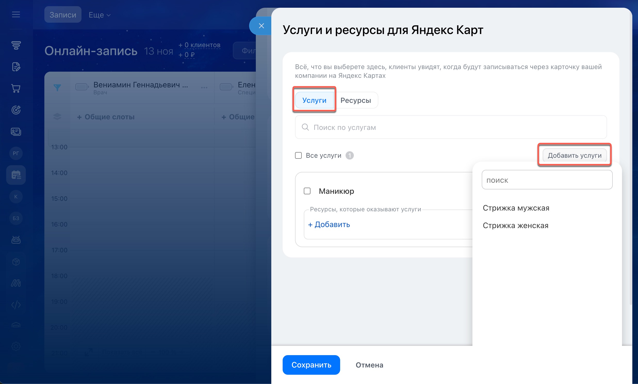 Чтобы клиенты могли записываться через Яндекс Карты, укажите, какие услуги доступны и кто их выполняет — ресурсы. Нажмите Выбрать ресурс и добавьте нужные услуги и ресурсы.