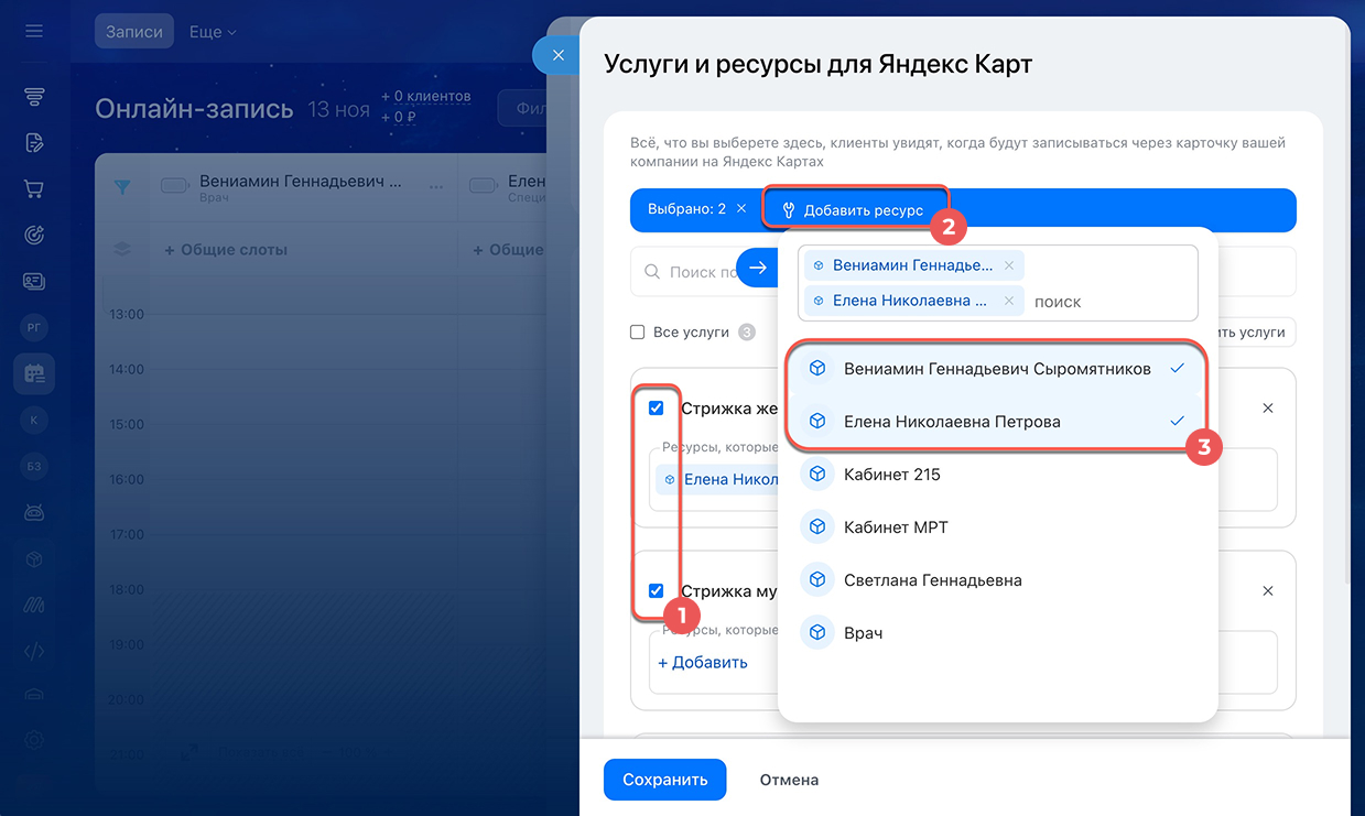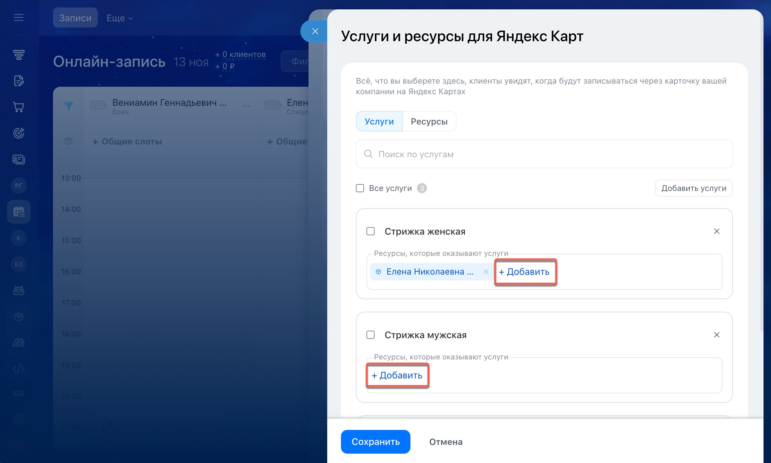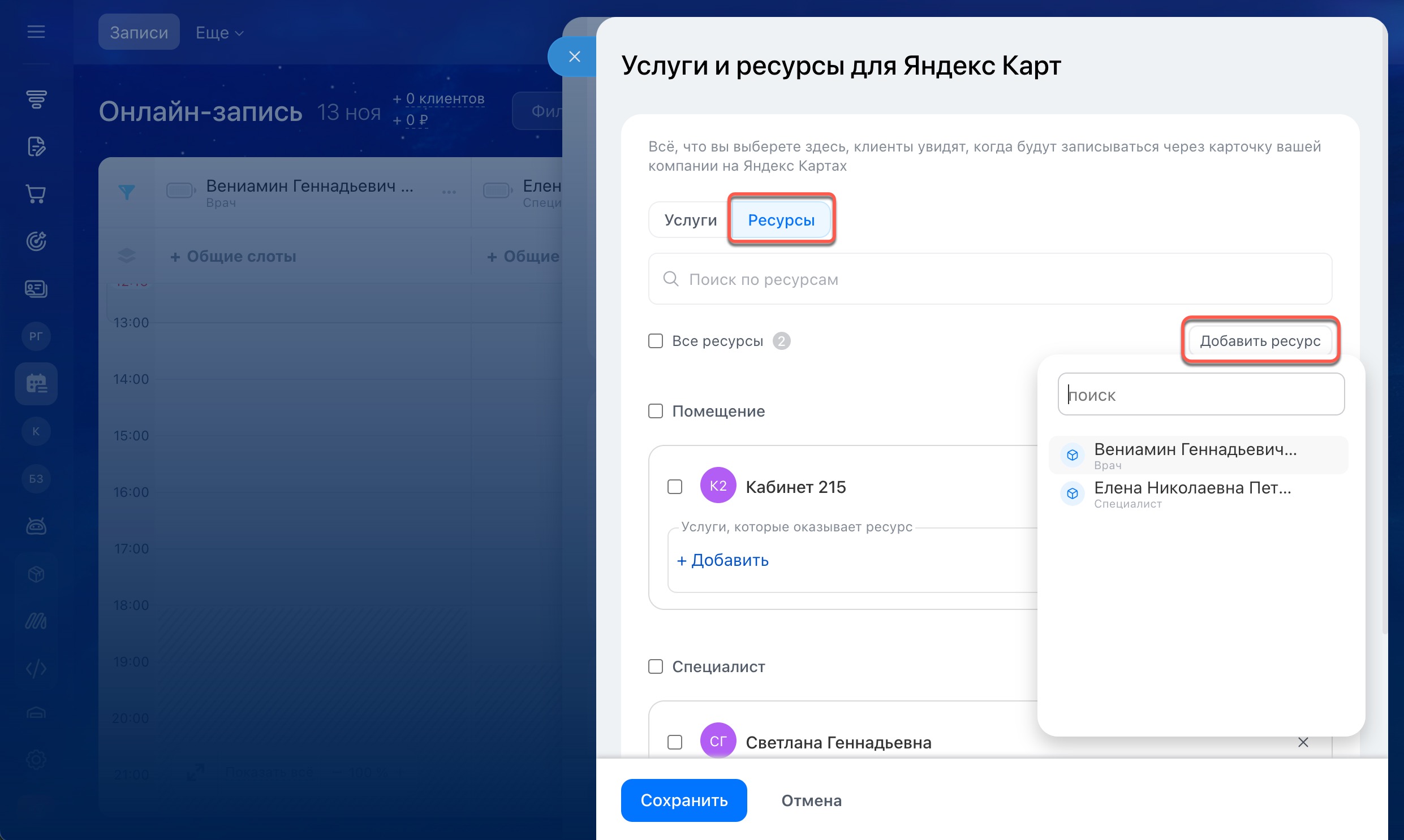 Ресурсы. Нажмите Добавить ресурс и выберите те, которые нужно отобразить на Яндекс Карте. Это могут быть врачи, автомобили, помещения для аренды и так далее.