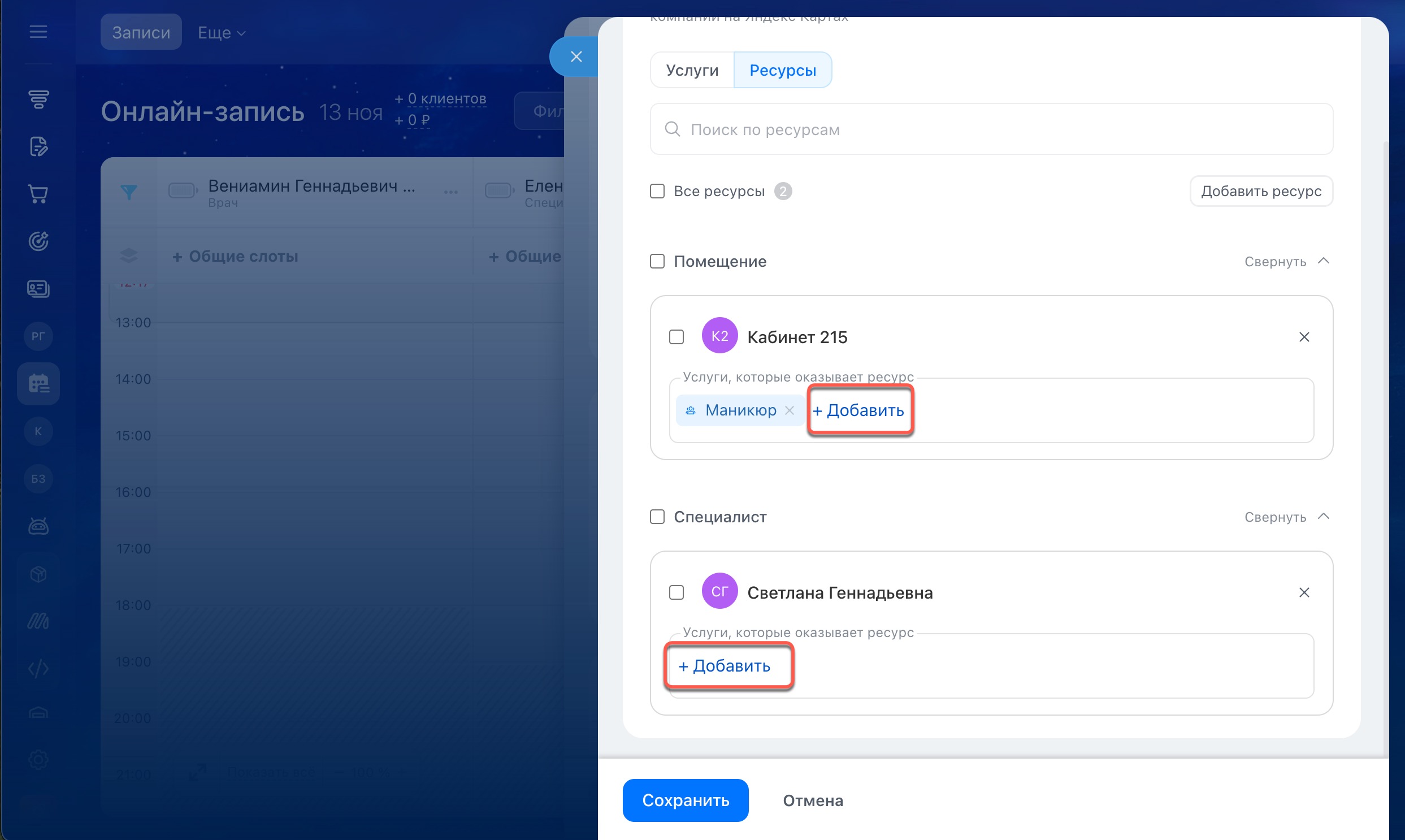 К каждому ресурсу привяжите услуги, которые с ним связаны. Например, к ресурсу «Кабинет» можно привязать услуги: маникюр и педикюр. Нажмите Добавить и выберите услуги.