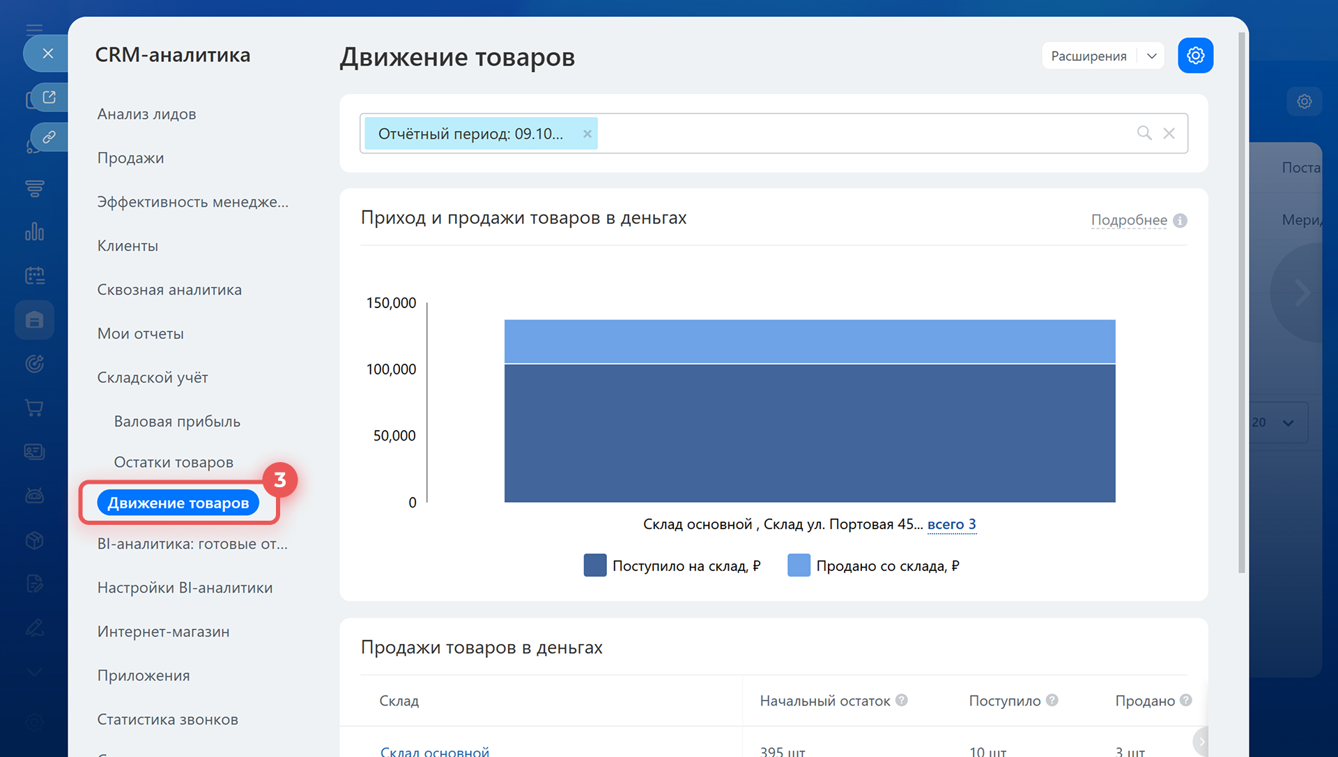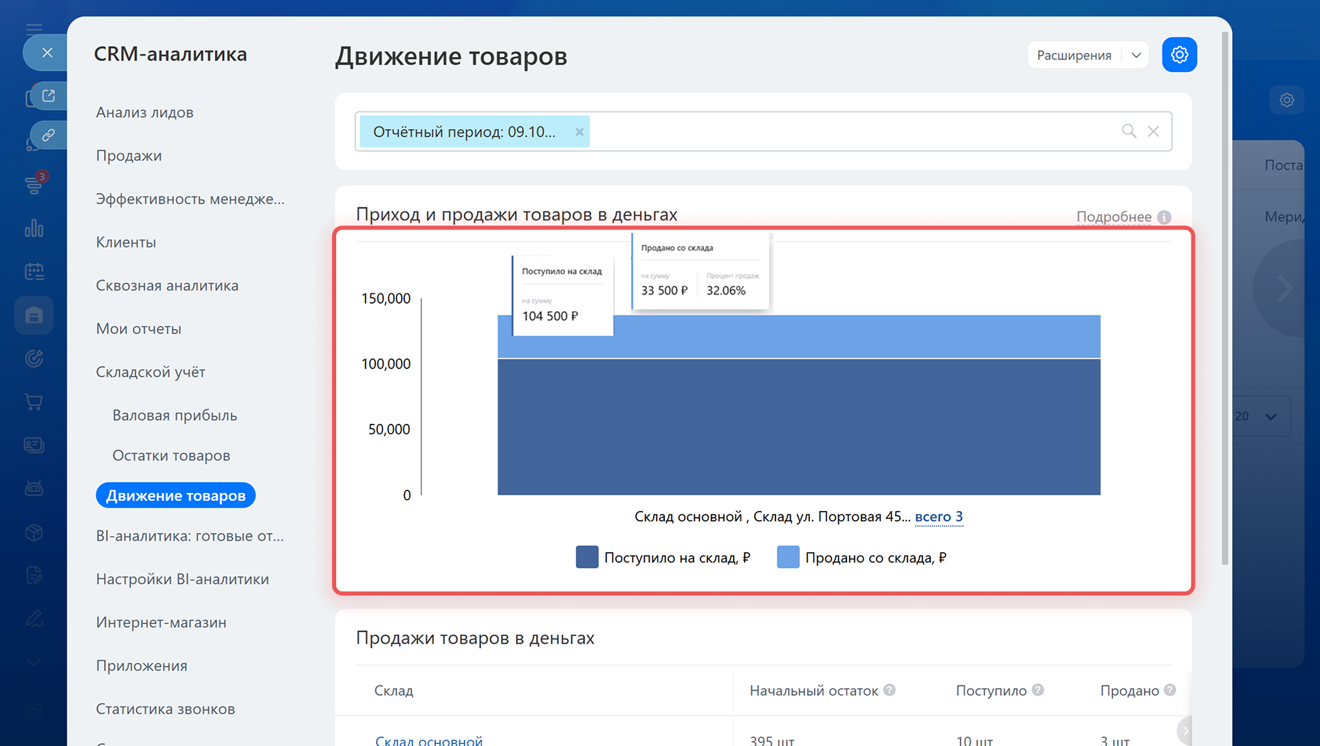 Отчет показывает, сколько товара поступило и сколько продано за выбранный период. Он помогает оценить оборачиваемость запасов и понять, где не хватает товара, а где — избыток. Например, если на склад поступило много товара, а продажи низкие, можно запланировать акцию или переместить остатки на другой склад.