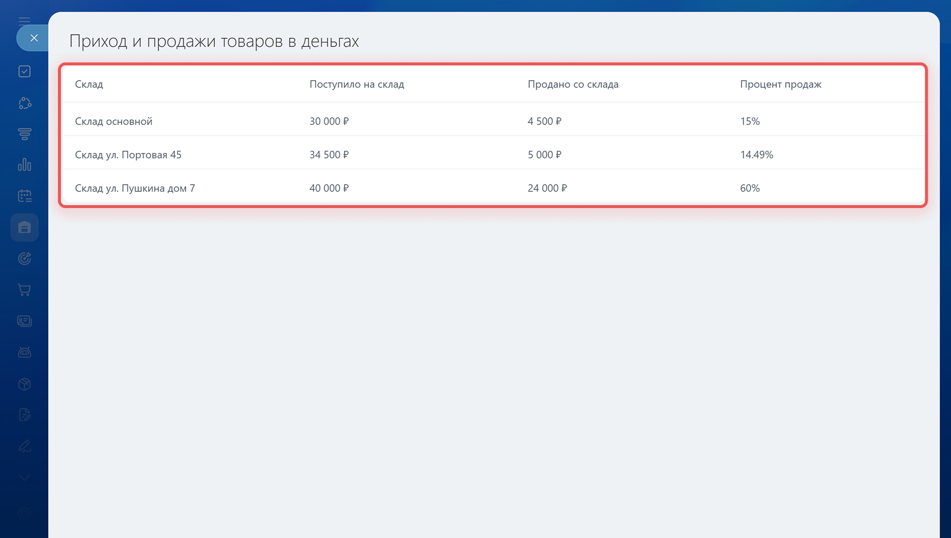 В верхней части отчета показаны суммы поступлений и продаж по выбранным складам и процент продаж за период. Суммы рассчитываются по закупочным ценам. Чтобы посмотреть данные по каждому складу, нажмите на график — откроется сводная таблица. Она поможет оценить разницу между поступлениями и продажами и решить, что делать дальше: пополнить запасы или переместить товары на другой склад.