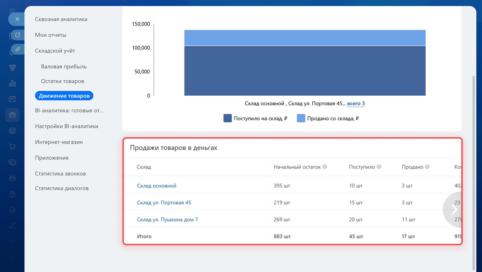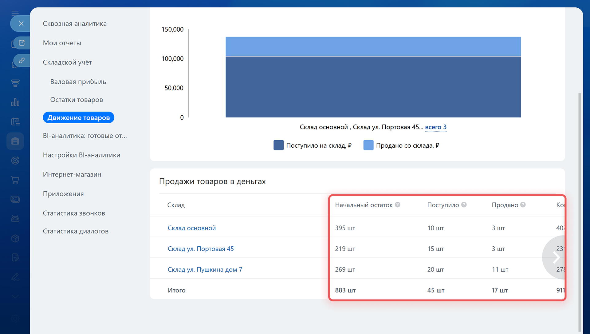 • В нижней части отчета — таблица движения товаров по складам. С ее помощью можно понять, как менялись запасы: сколько товаров было, сколько поступило, сколько продали и что осталось.