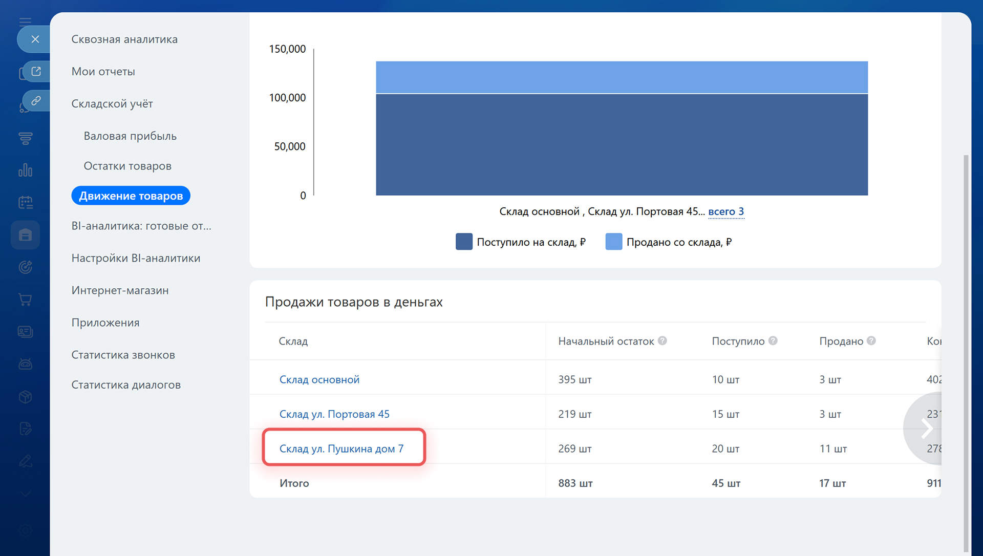 По каждому складу можно посмотреть подробную информацию с разбивкой по товарам. Нажмите на название склада — откроется таблица с остатками, поступлениями и продажами за период. Эти данные помогут определить, какие товары продаются быстро, а какие — медленно, и принять решение: пополнить запасы, переместить излишки или устроить распродажу.