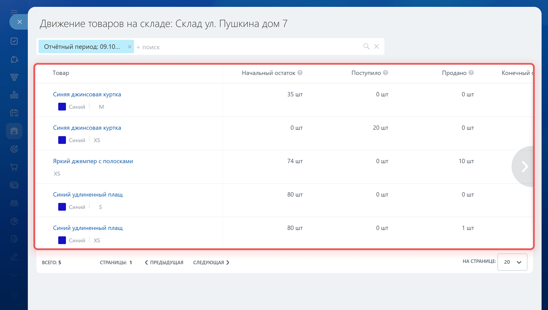 • Начальный остаток — сколько было товаров на складе в начале выбранного периода.