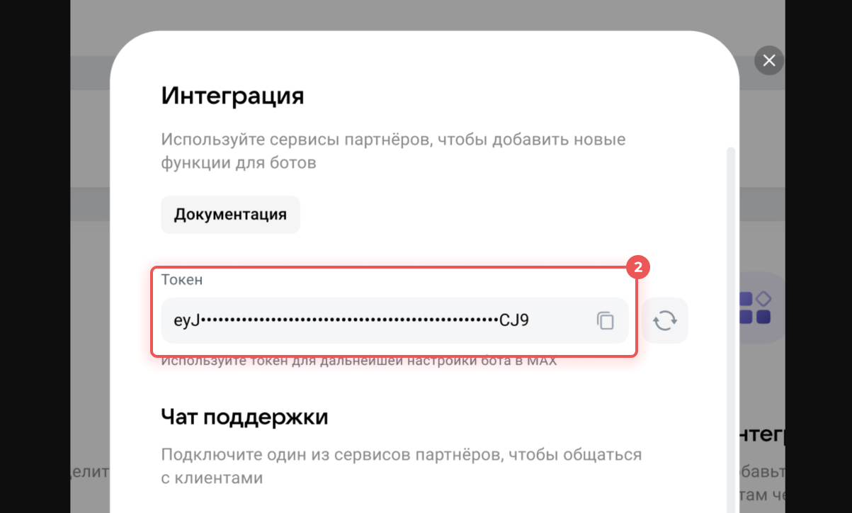 Когда бот пройдет модерацию, сгенерируется токен доступа. Получить его можно в разделе Интеграция.