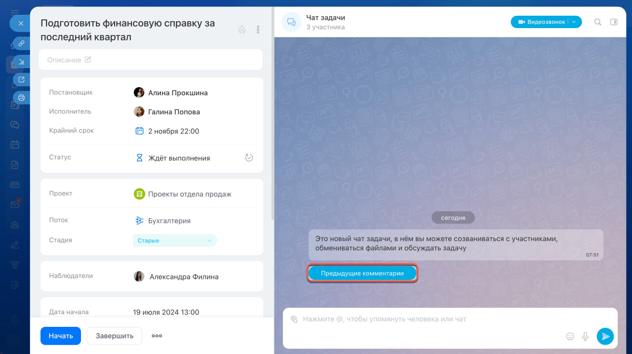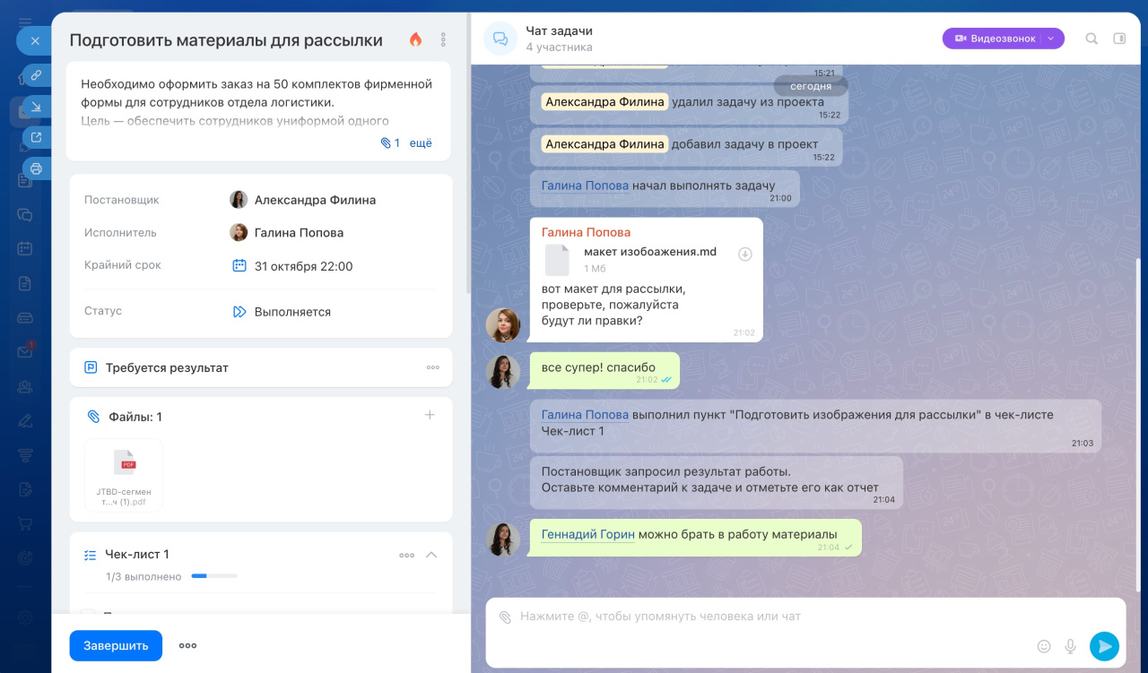 Внутри карточки теперь есть чат — он сохраняет весь контекст обсуждения: можно увидеть последние изменения, созвониться, уточнить детали и быстро принять решение, не покидая задачу.