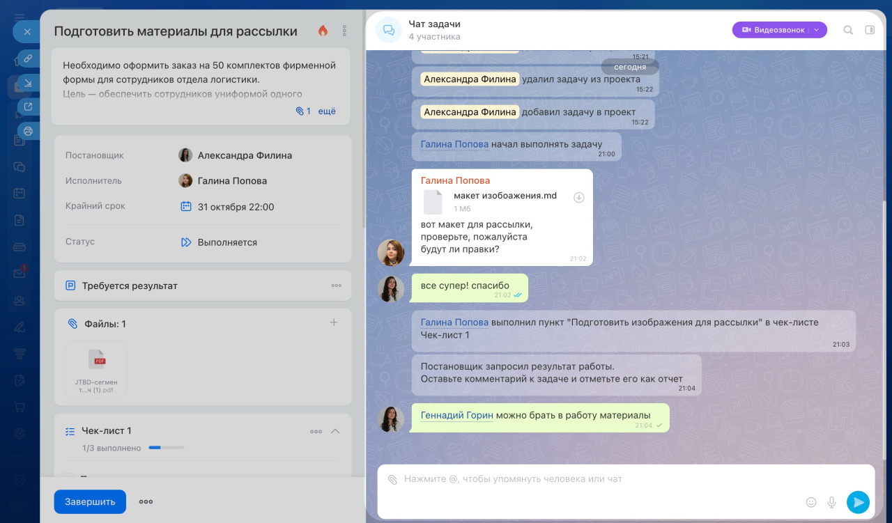 - Быстрая коммуникация и решения — чат задачи ускоряет общение: команда обсуждает вопросы привычным способом, как в мессенджере. Решения принимаются быстрее, обратная связь приходит сразу, а задача движется к выполнению без задержек.
