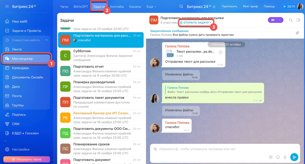Перейти в список чатов задач можно в разделе Мессенджер > Задачи и в разделе Задачи и проекты > Чаты задач.