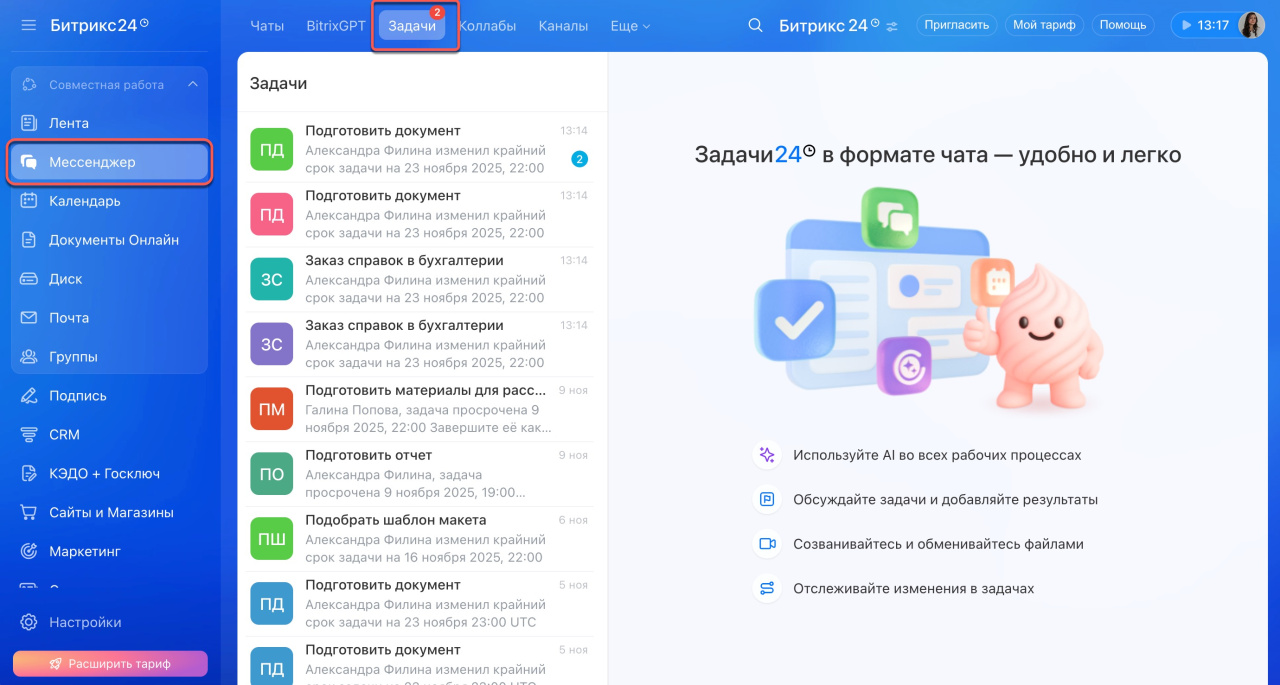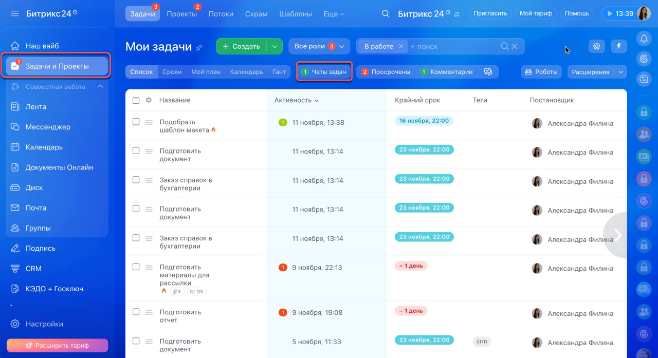 - Следите за счетчиками в разделе «Задачи и проекты» или в мессенджере, на вкладке «Задачи» — они показывают общее количество новых событий и подсвечивают задачи, где появились обновления.