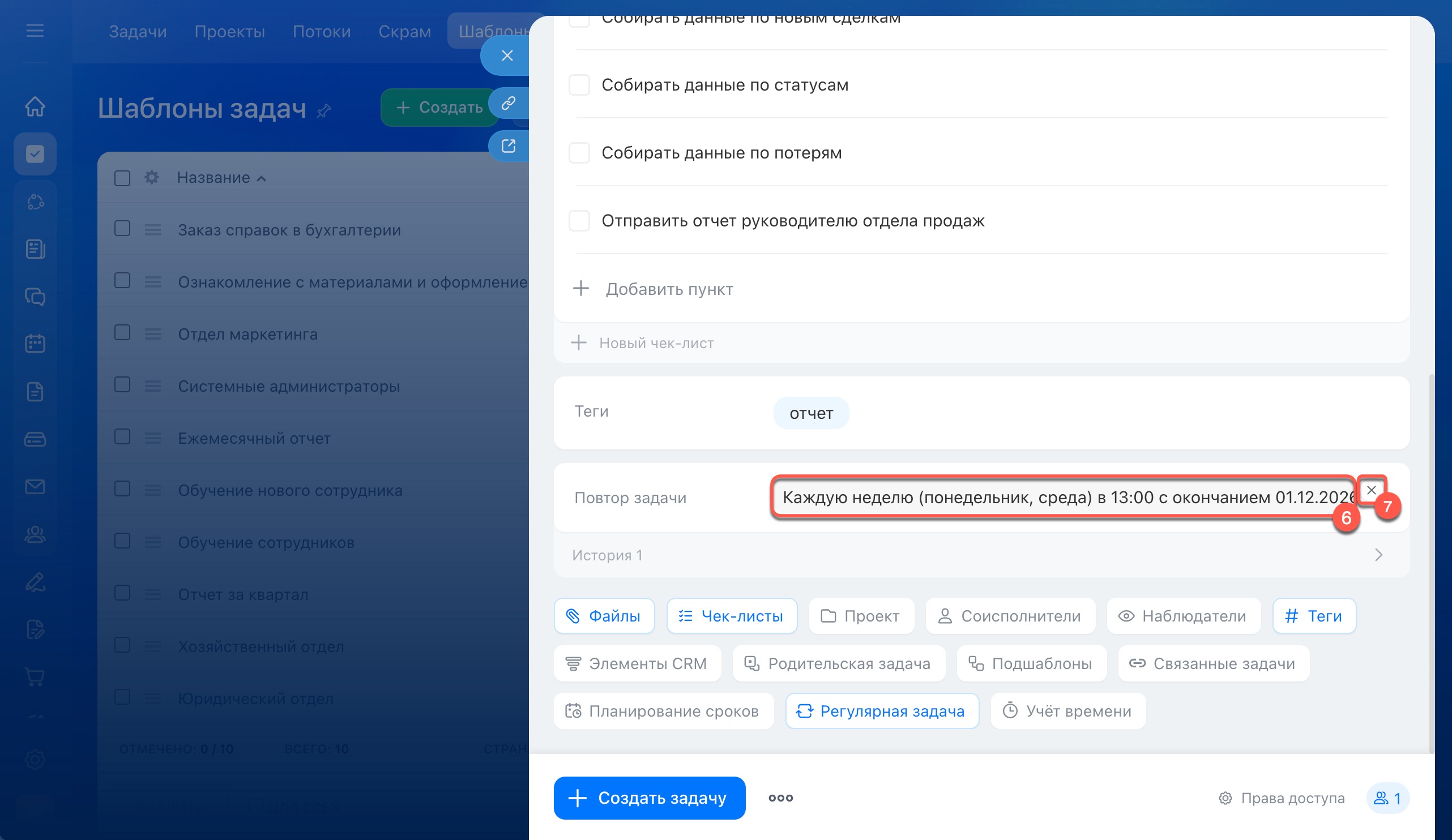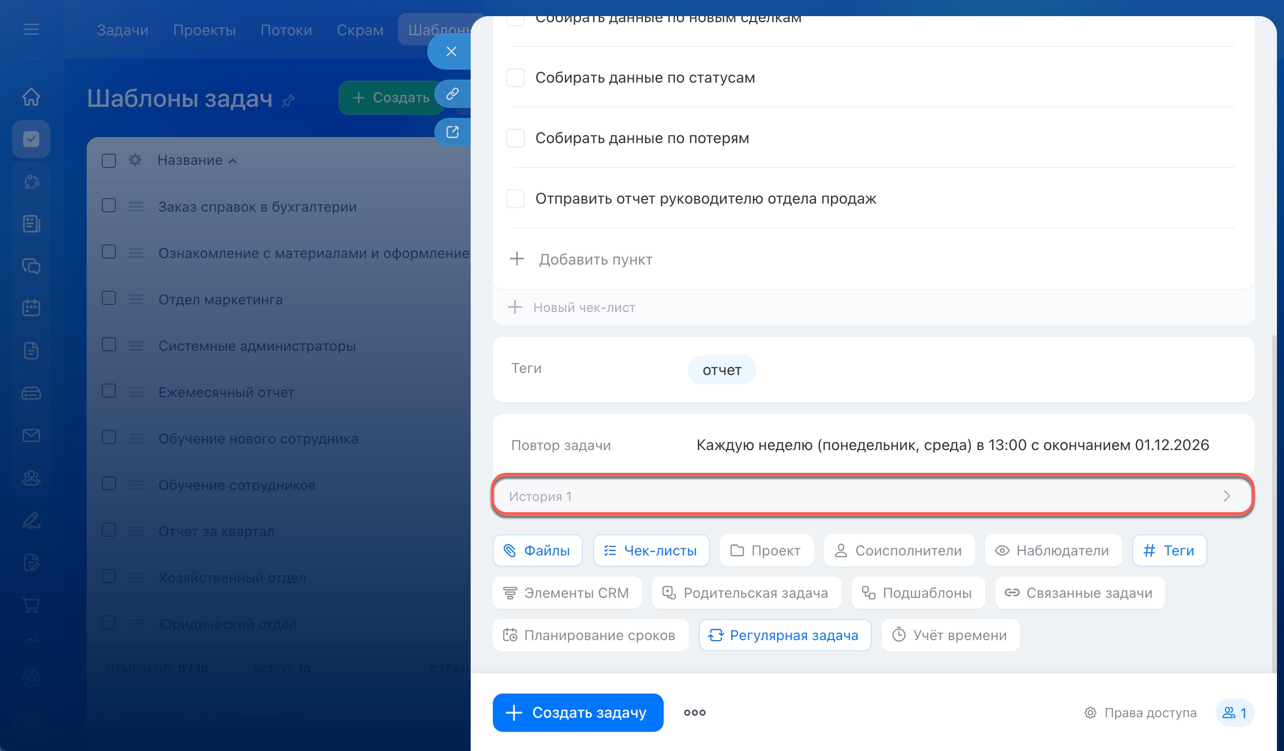 После настройки шаблона вы можете управлять регулярными задачами — просматривать историю их создания и настраивать права доступа.