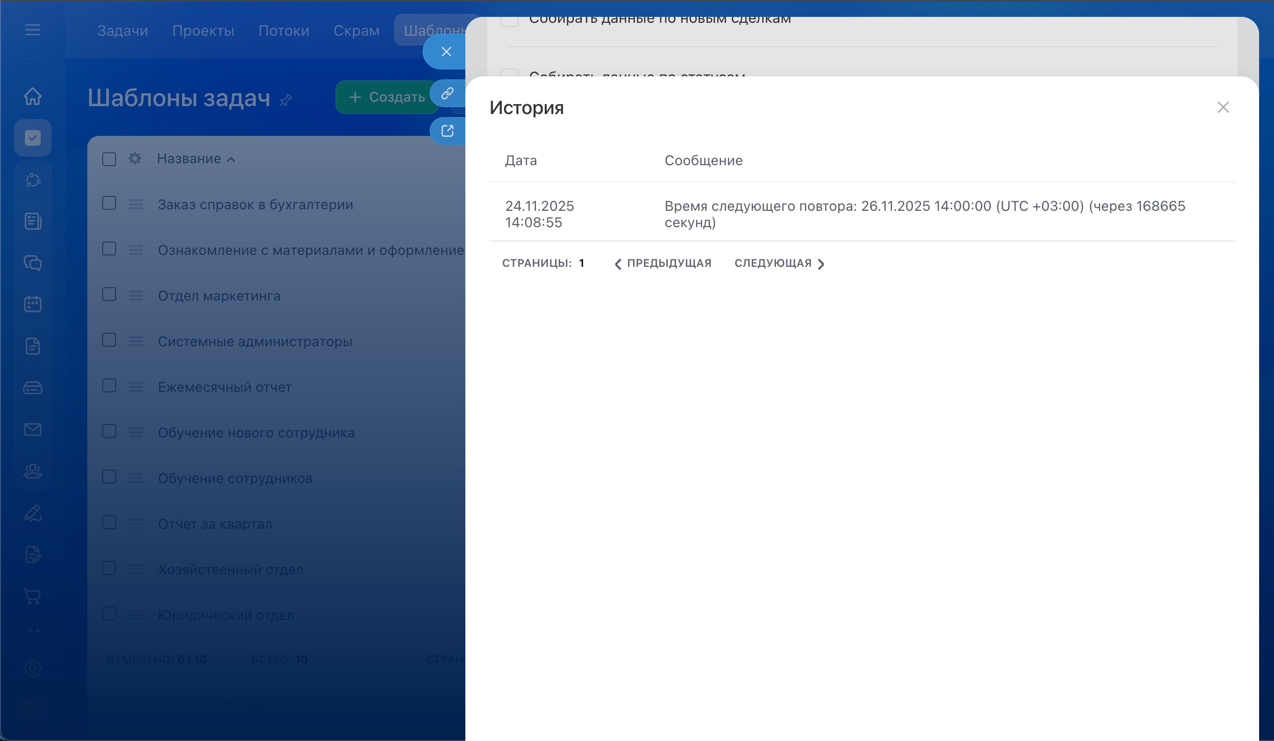 - В шаблоне сохраняется история созданных задач.