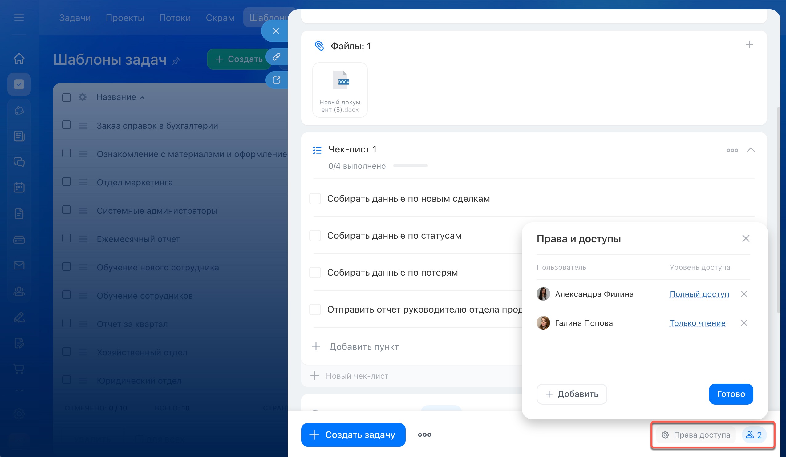 Права доступа к шаблонам задач