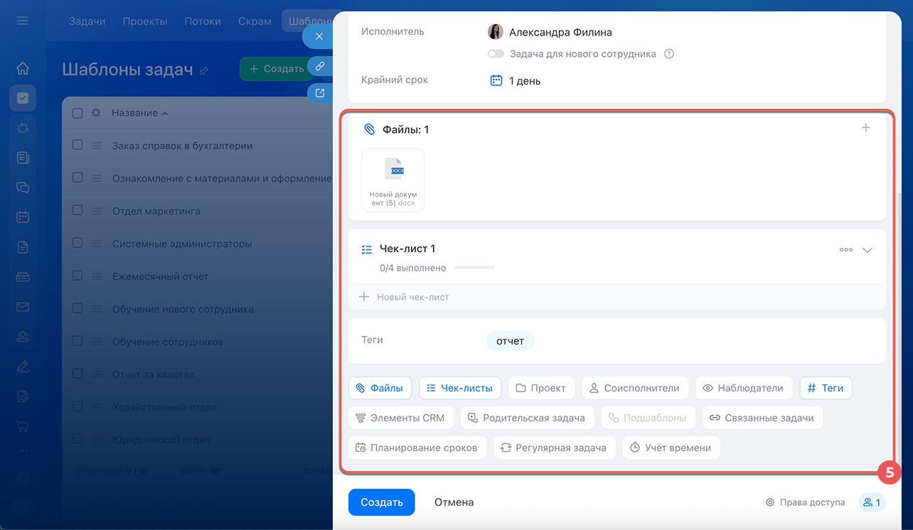 5. При создании шаблона заполните основные поля — название, описание, исполнитель, крайний срок и другие. При необходимости добавьте дополнительные элементы — например, файлы, чек-лист и напоминания.