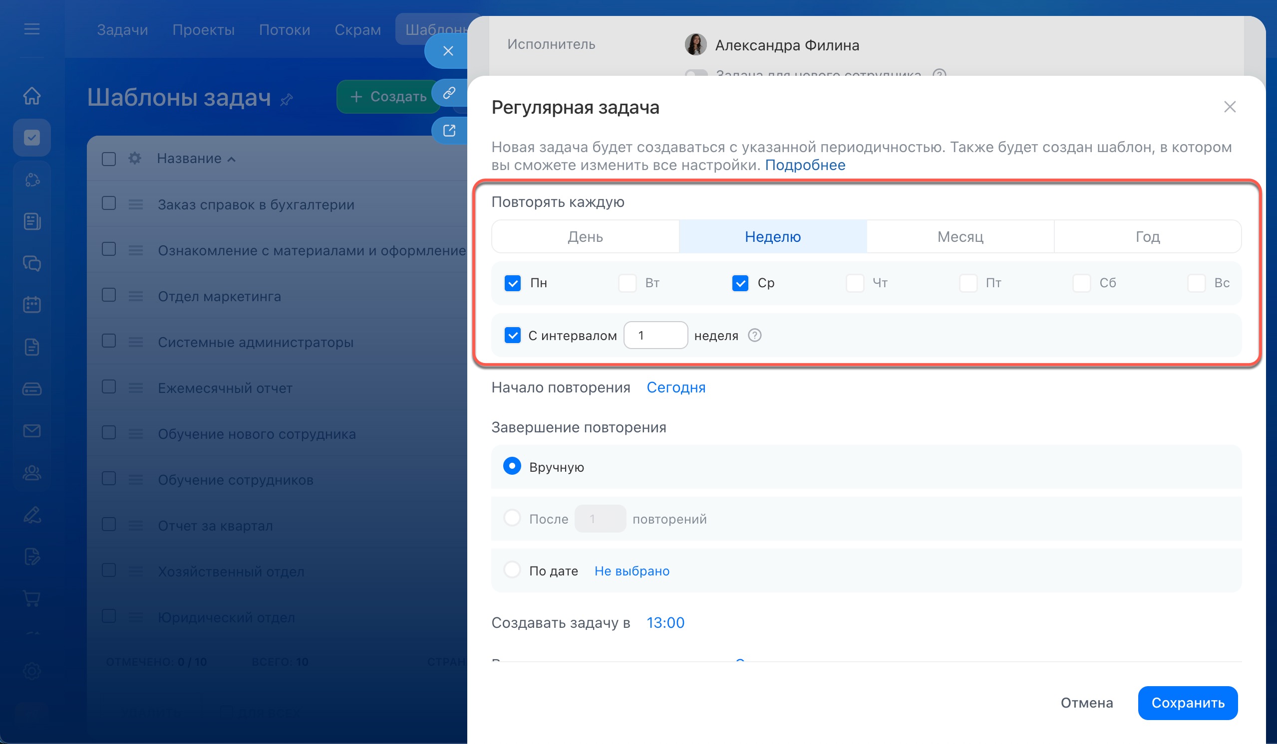 Настройки регулярной задачи помогают точно задать, как и когда будут создаваться новые поручения.