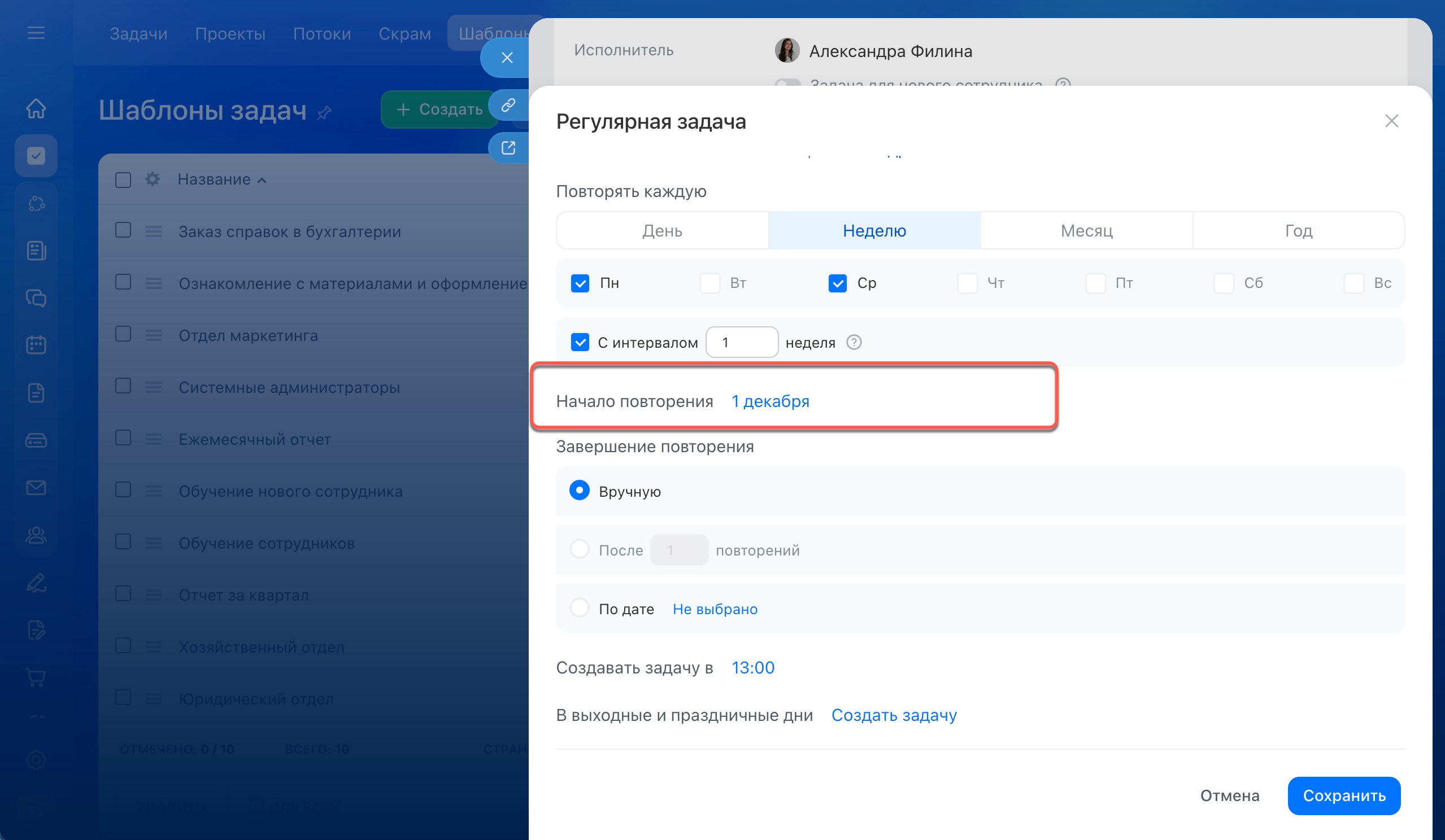 Укажите дату начала повторения — день, с которого задачи начнут создаваться по расписанию. По умолчанию регулярные задачи создаются сразу после настройки, но можно выбрать конкретную дату старта.