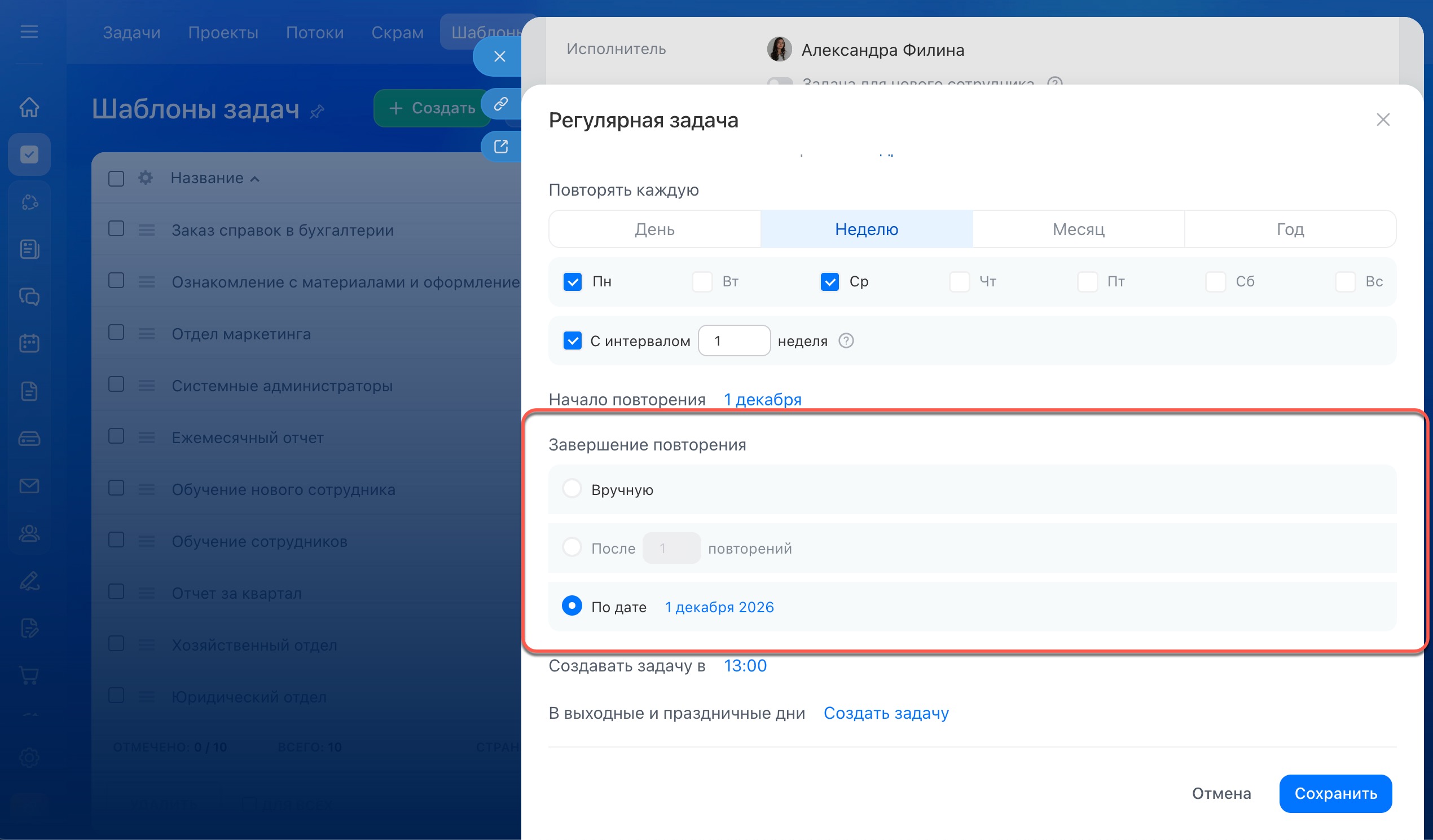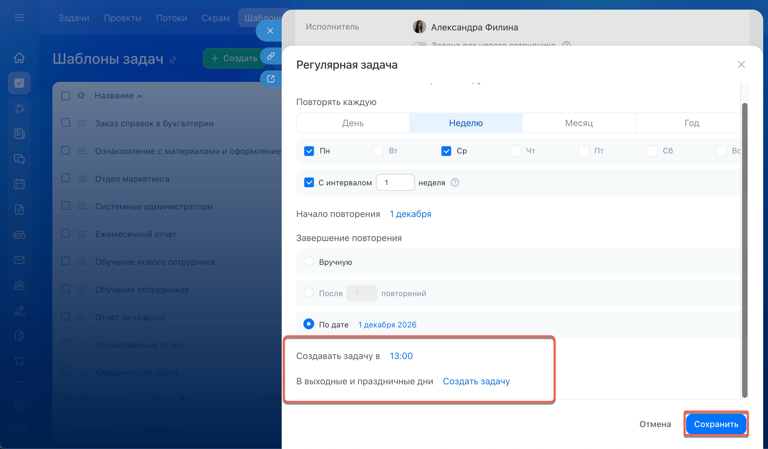 Укажите, создавать ли задачи в выходные и праздники — если дата повторения попадает на нерабочий или праздничный день, по умолчанию задача будет создаваться в этот же день. Чтобы она появилась на следующий рабочий день, выберите вариант «Не создавать».