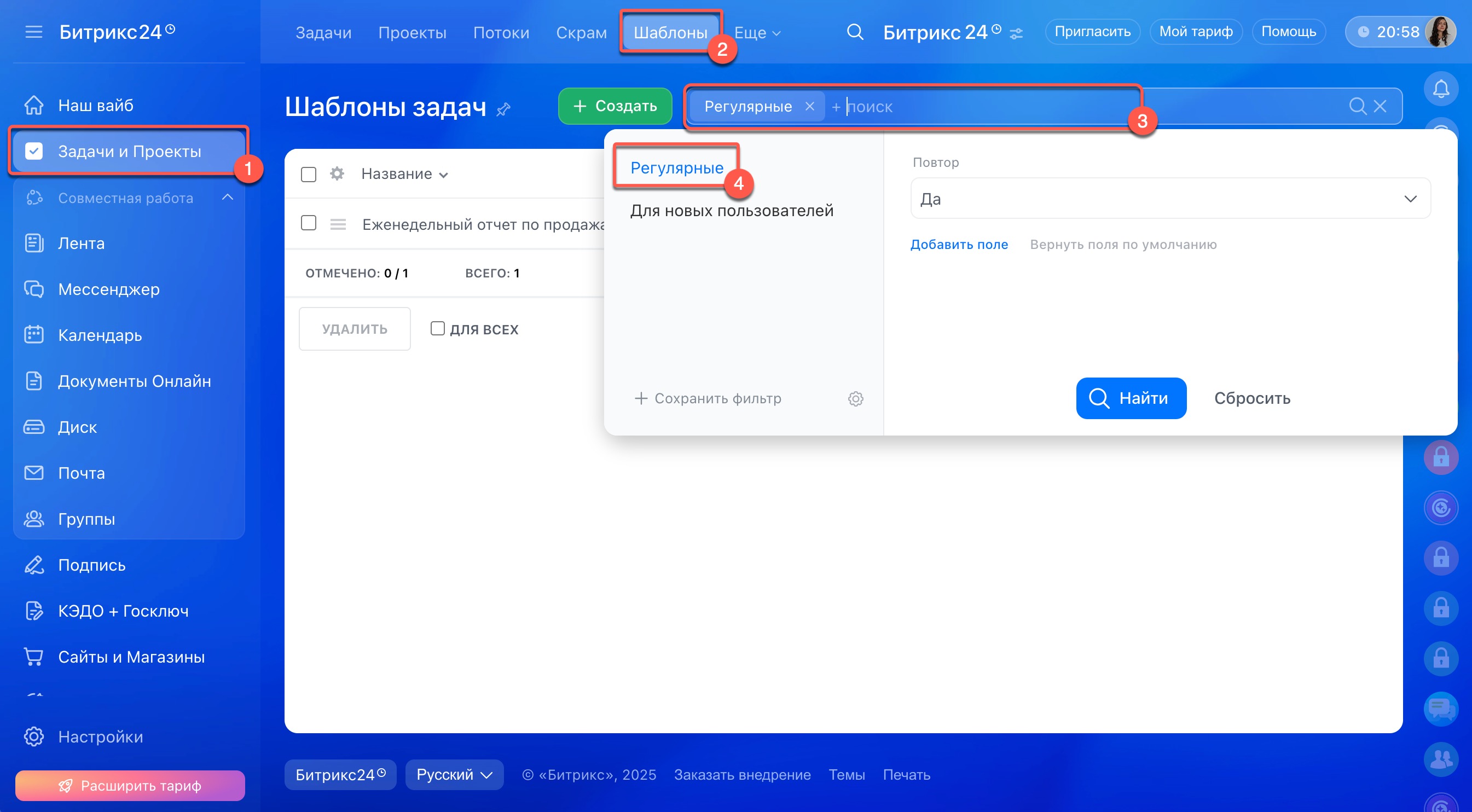 1–2. Перейдите в раздел Задачи и проекты > Шаблоны.