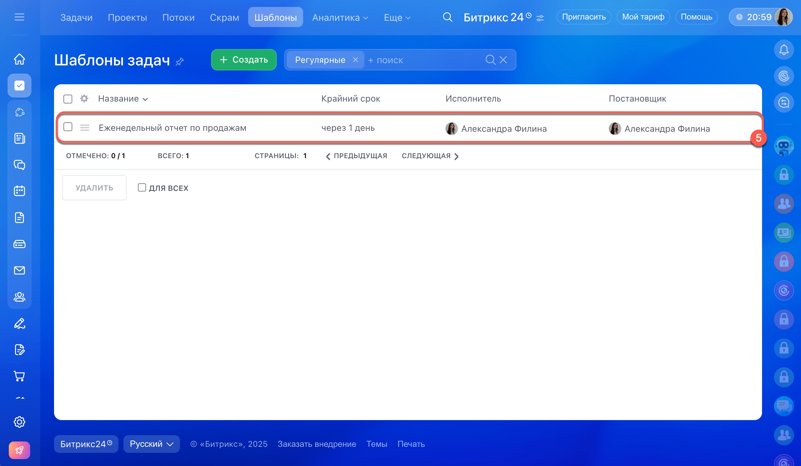 - Регулярные задачи создаются на основе шаблона: вы один раз задаете параметры, а Битрикс24 создает новые задачи по этим правилам.