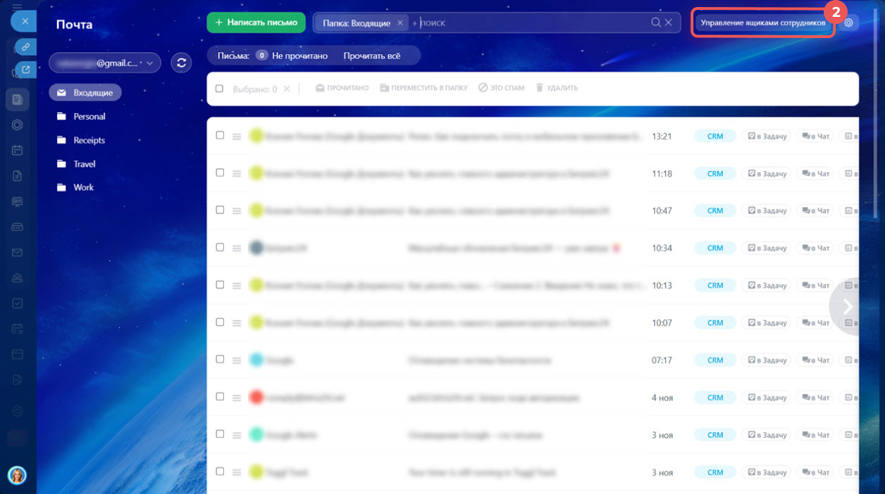 В Битрикс24 можно централизованно управлять почтовыми ящиками сотрудников: просматривать список подключенных, добавлять новые, настраивать права доступа, проверять, связана ли почта с CRM.